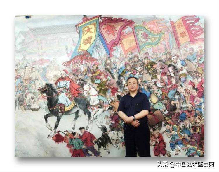 中国画的“极致写实”也有感性的因素,和西方写实油画所用的三维立体素描、环境色彩、人物体积的高光等元素不同,中国话是在人物二维半的规范内塑造体量感和用固有色彩等来表现画面效果的,这就是中西方绘画的区别。有人改造中国画,把西方素描带入中国画,素描+水墨,不伦不类,简单化套进去,没有消化。李老师的工笔画,不是三维立体,没有明显高光,只画固有色彩,不画环境色,用西方线性素描,是二维半。远看是大平面,近看是凹凸,衣纹深染色,是凹凸法,传统基础上深入了、强化了。他的作品《李自成进京》就不用三维立体,是平面的,否则传统味道不够。