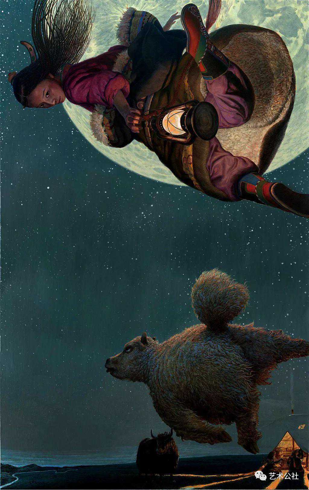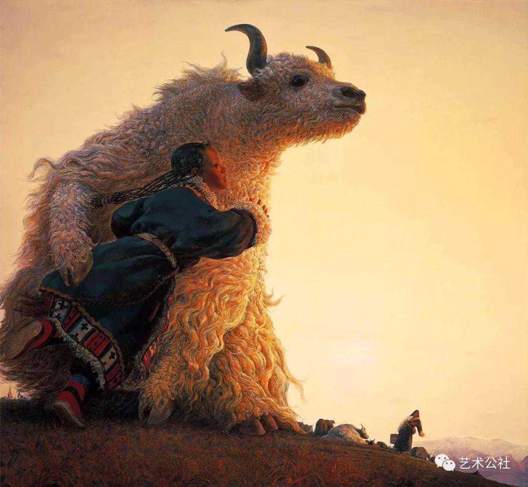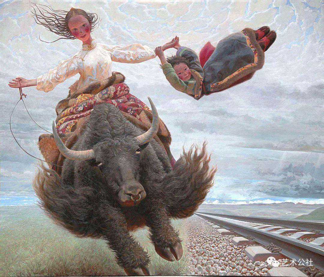 积极浪漫主义艺术重视民间生活,特别是淳朴的乡村生活。在德国和英国,浪漫主义都是从搜集中世纪民间文学开始的。中世纪民间文学不受古典主义的清规戒律的束缚,其想象之丰富,情感之真挚,表达之自由,语言之通俗,远胜于后来的以启蒙为目的的说理文学。对工业化时期的社会秩序的不满,促成了这种艺术解放的激情。失望和不满产生了艺术的双胞胎:有些人用愤怒、咒骂、避世、醉生梦死来表达绝望的心情,是为消极浪漫主义一派;积极浪漫主义则用新的艺术形式表达希望和理想。王沂光属于后者,他用美丽的村姑,饱经沧桑的老汉,古朴的茅屋,飘扬的红丝巾等意象,表达自己和对生活的理解。如《风的诉说》,作者用两位飘起的女子和白色的牦牛组织了他对风的赞美,朝日,大地,河流,组成了辽阔的背景,由此构思了一个富有动感的画面。我们不妨这样假设:如果同样的背景下,是两个脚踏在草地上的女子和两只牦牛,那会是完全不同的另一种效果。可以说,王沂光有意用这种有些调皮、有些夸张的方式,赋予了对象以超于凡俗的美感,并以此显示出自己的另类风格。