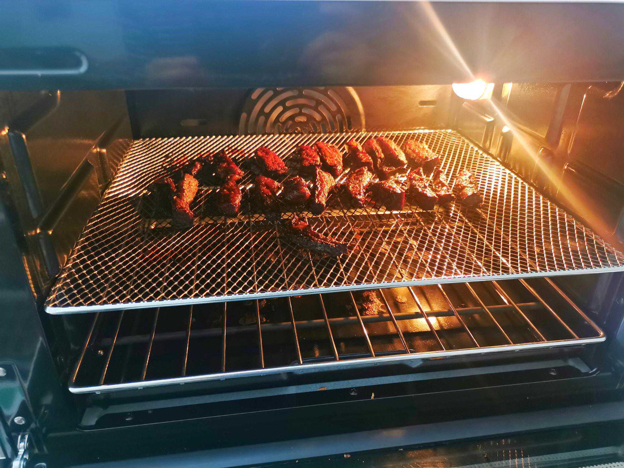 4、腌制好的牛肉条放在烤网上晾一天,不要放在太阳下晒,放在通风处就可以了,不等这么久的话,也可以用家中的电吹风,将牛肉表面吹干。