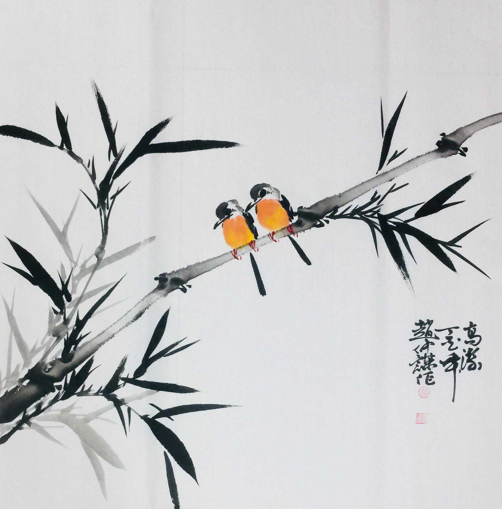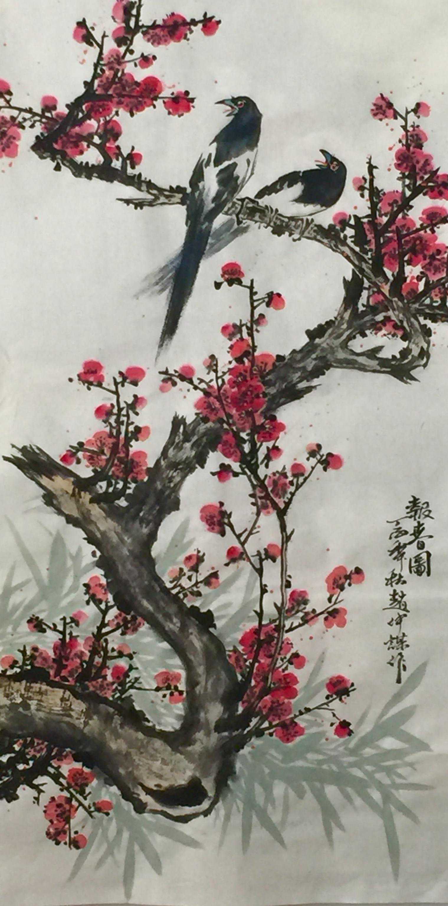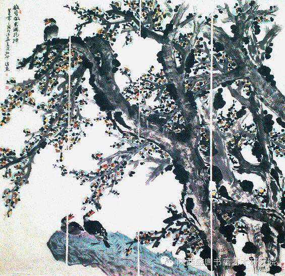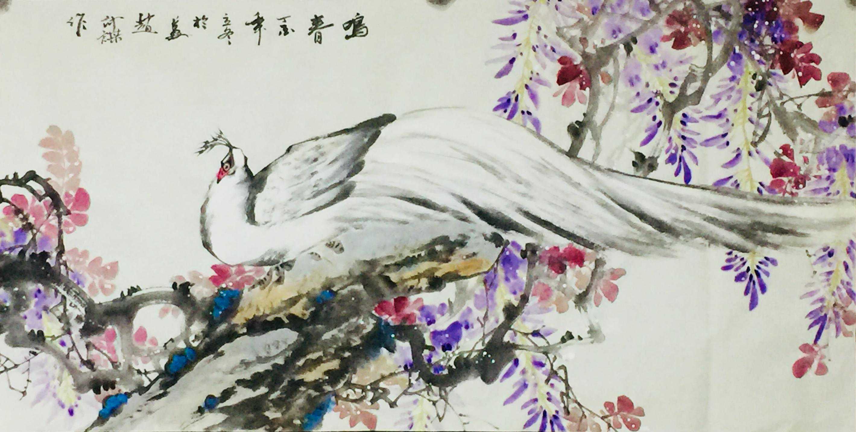 赵仲谋在写好书法艺术的同时,经过西安美院、清华大学美术学院高研班的进修,对花鸟画尤其山水画有了飞跃的进步,在他的画室看到了许多巨幅花鸟、山水创作作品。因在长期的探索与写生和进修的理论指导下,逐渐找到了一种属于自己的绘画语言,这种语言是新颖的,是建立在大写意与工笔花鸟上寓于表现力的,是通过艺术的整合提炼而成的。他将典雅与自然、飘逸与沉稳、简洁与繁杂、严谨与率意十分巧妙地融合于一体,在意与象、形与神、色与墨、收与放、紧与松等意境之间化增与减的调试,以求达到最佳的画面效果。所以,赵仲谋的作品具有双重审美特征,既有西方绘画重视光、影、色的一面,又有东方绘画突出意、情、神、趣的一面。或者说作品的形式更趋近于西方,但其神韵则是东方式的。赵仲谋花鸟画的更大突破,正在于一改纤巧之风,大胆立意、浓墨重彩,将浓重绵密的山水用墨实践和浑厚结实的汉唐造型技巧,进行了成功移植和运用,赋予了花鸟、山水画一种灿烂拙朴的英雄主义色彩,又不乏亲切灵动的生动情趣,令人一睹为快,为之震撼。赵仲谋的作品具有现代潜质的绘画色彩,那是他在首都清华美院高级研修班修成正果的再现,也是从理论到实践,在绘画作品中颇有现代审美意趣的线、色、墨、水的有机融合,是具有抽象精神的民间美术样式,那些饱满充盈、富有张力的画面,都暗含着他对现代人文精神的理解,在现代审美意境的转换上赵仲谋无疑有更高的代表性。