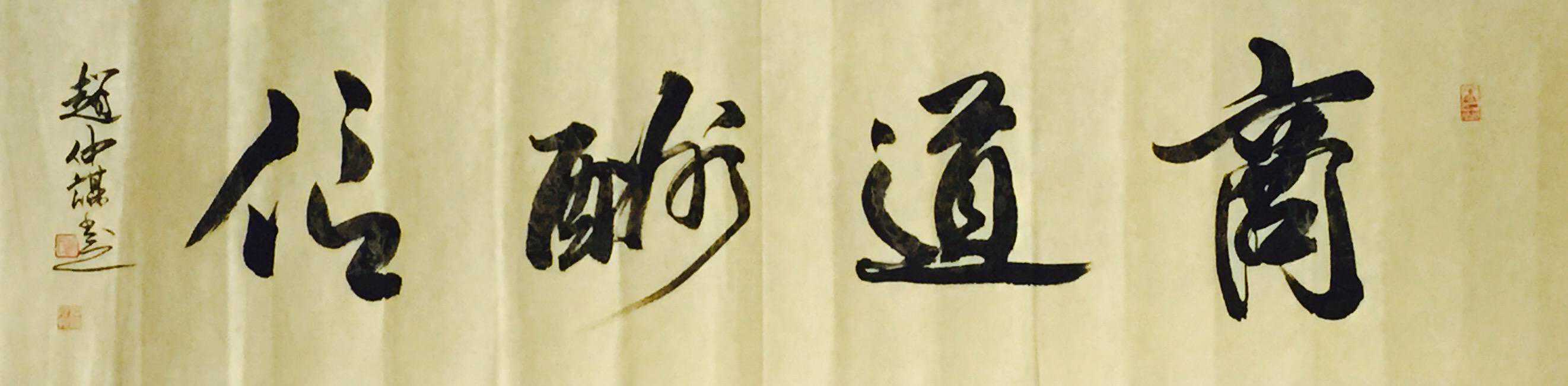 赵仲谋先生的书画艺术经名家指点,日趋成熟。他的书法结构严谨,自然洒脱,风格大胆,章法新颖。他总能把“虚与实、动与静、拙与巧、简与繁、黑与白、浓与淡都能很好的融合,表现在同一天地里。他的作品多变,功力扎实。其行草气韵酣畅、挥洒自如、放而不纵、收而不拘”;隶属淳朴厚实却神采飞扬。所有作品,静神观赏。和谐、优美、宁静,使人感到他的结字、用笔、章法、造型上沿袭了古韵,但更多的是现代的气息和时代风格。
