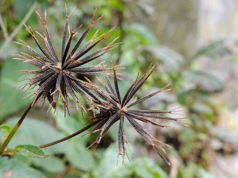 我记得每年黄豆收割的季节,去采收黄豆的时候,一定要穿一件比较光滑的衣服,否则回来的话会沾一身的鬼针草,我们那儿叫它“甲鱼叉叉”。你看上图,它的样子是不是就像是用来叉甲鱼的那种叉子呢?