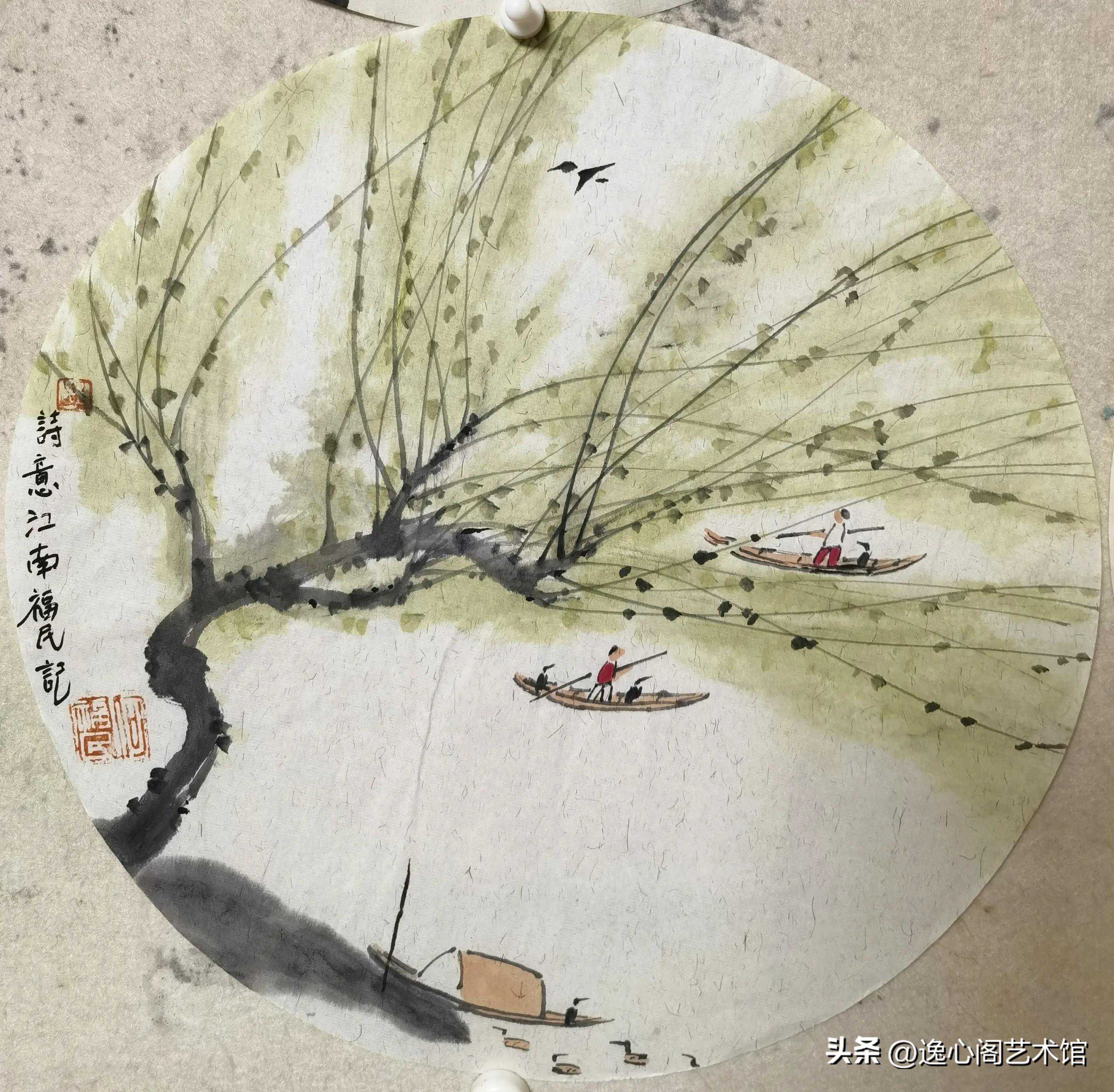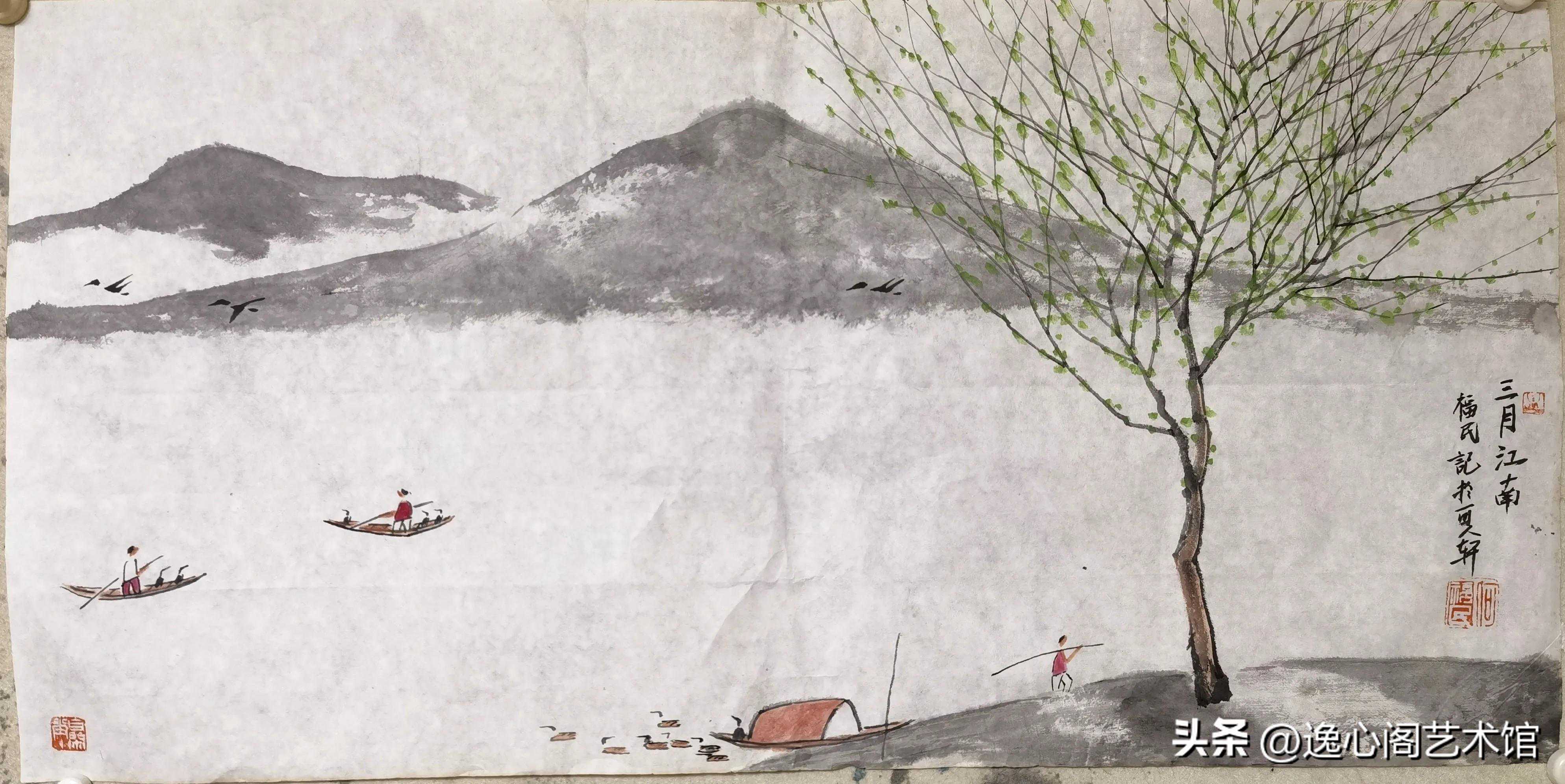 远处,一只小船悠然自得地漂浮在清澈的河面上。船身随着水波荡漾,仿佛在轻唱着江南水乡的民谣。船桅上停着一只飞鸟,它展翅高飞,似乎在为这美丽的江南画卷增添一抹生动的色彩。