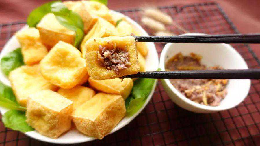 油豆腐也被称为豆腐泡,其主要原料是黄豆,经磨浆、压坯、油炸等多道工序制作而成。油豆腐块体积约八立方厘米,色泽金黄,外皮光滑,内如丝网,细软绵实,富有弹性,一捏成团,放开还原,存放一月,不霉不变。