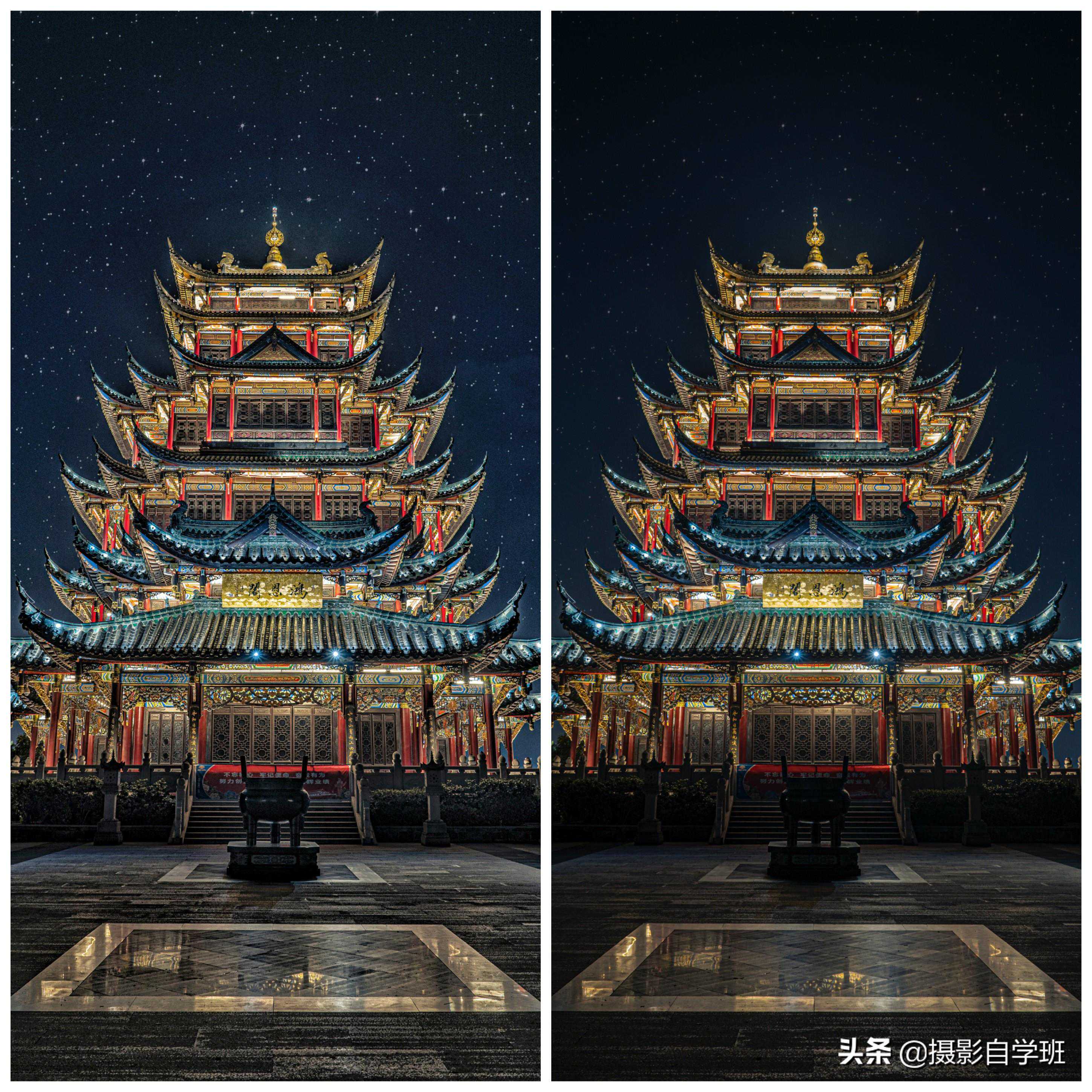 下面这张摄影作品,天空有星星细节,建筑虽然已很明亮,但还可以更好。我们可以: