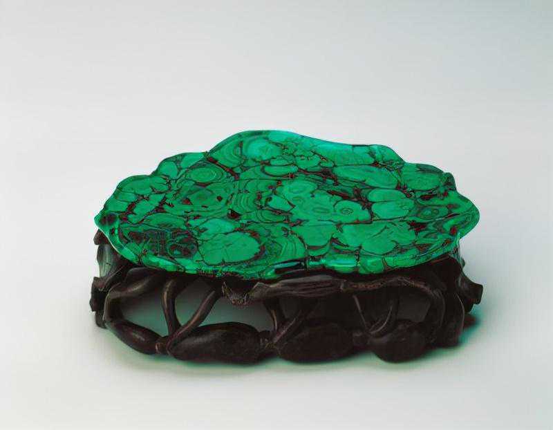 孔雀石盘,清,高1.8cm,长20.7cm,宽15.4cm。