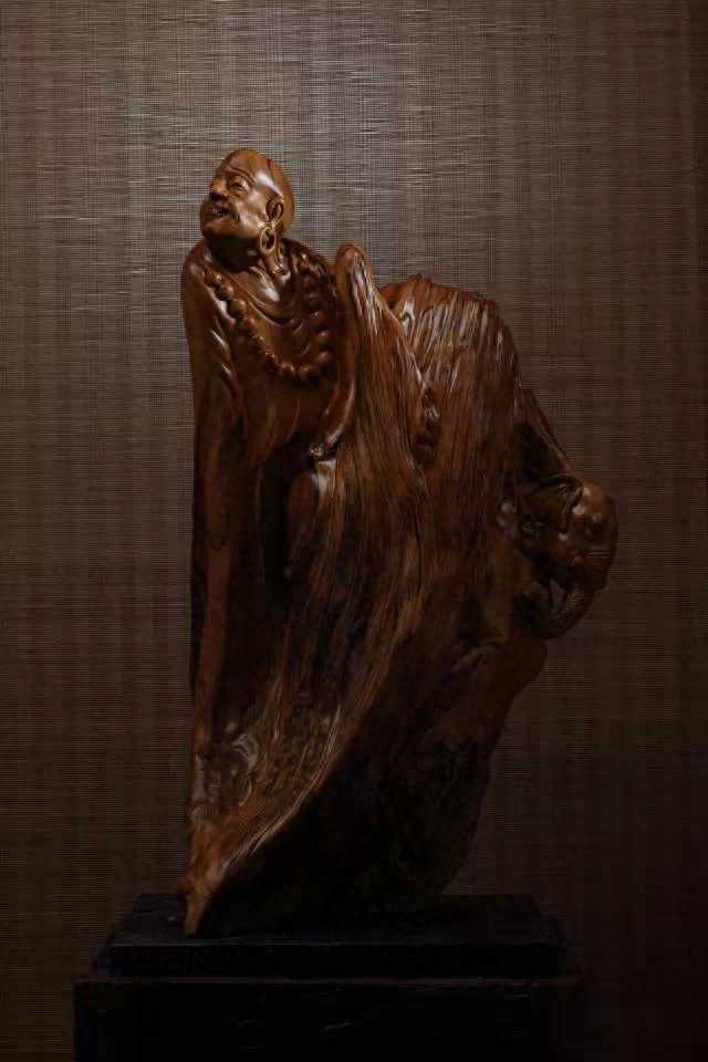第七位就是骑象罗汉崖柏根雕,骑象罗汉是佛主的侍者,他原本是一名驯象师。