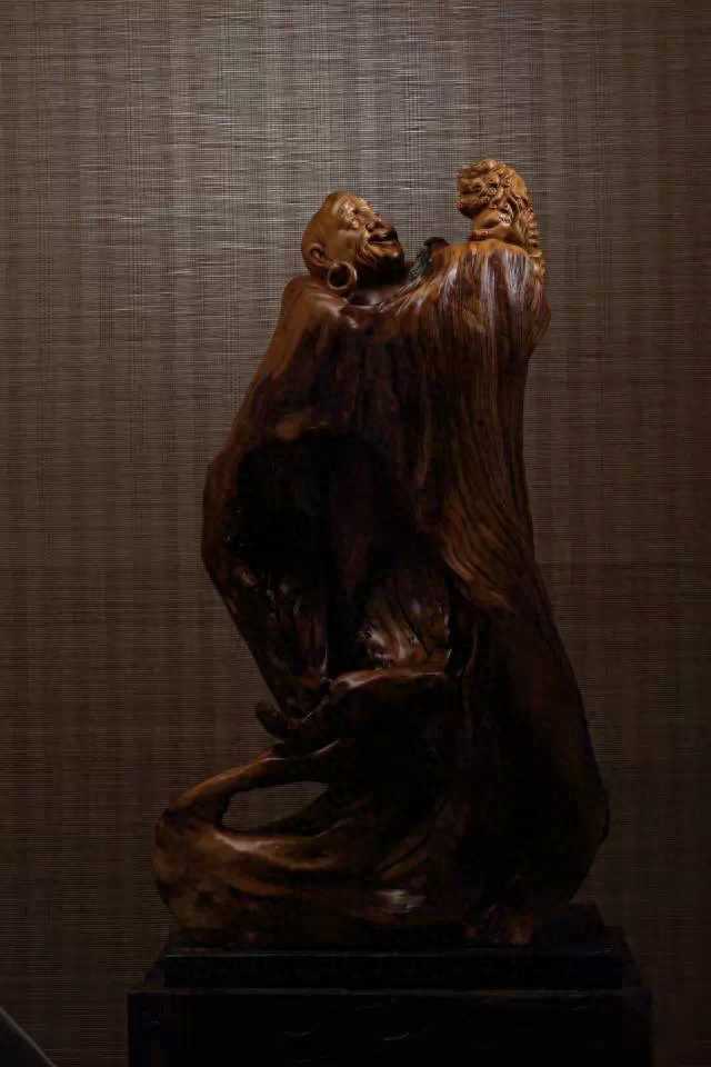 第八位就是笑狮罗汉崖柏根雕,意思为金刚子,原现是一名猎人,因为学佛,所以不再杀生,狮子来谢,故有此名。