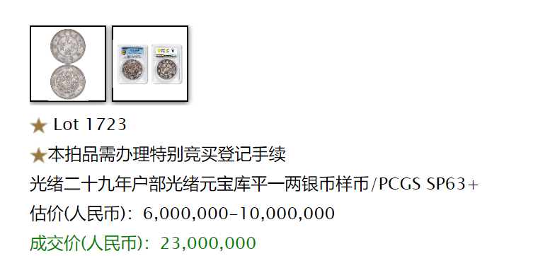 这种钱币就是因为当时它的面值比较奇特所以,最终没有审核通过只要少量的样币留存下来,这种钱币它的收藏价值可能就是上百万级别的存在,不过它的数量非常少,可能仅仅只有几枚这样的钱币。今天我们讲到的户部光绪元宝是一枚银币“光绪二十九年户部光绪元宝库平一两银币样币”当时在去年的时候就成交了2300万的天价,在我们市场上面能过千万的钱币非常少,估计不会超过十个。所以收藏的话还是选择不一样的。