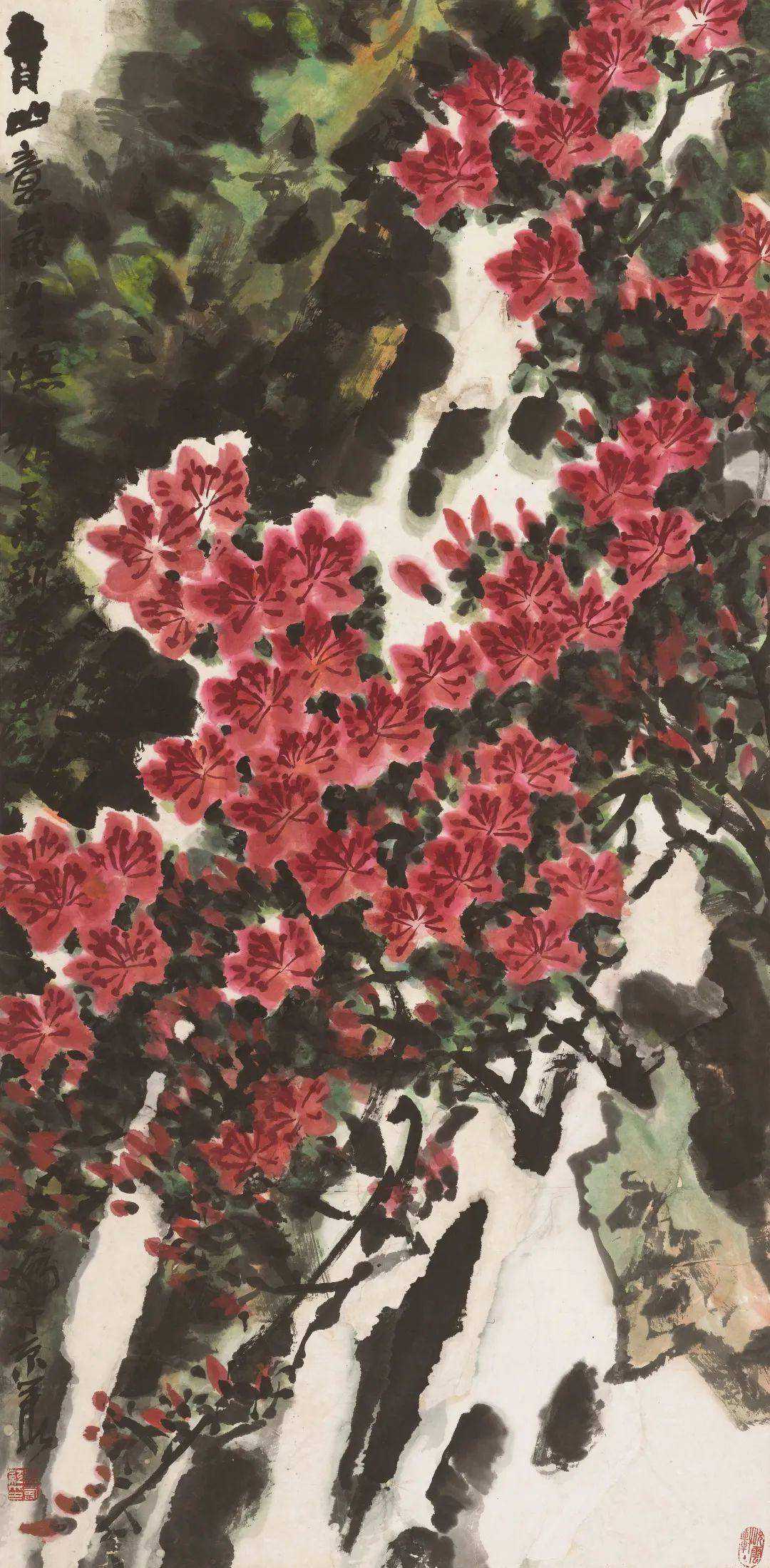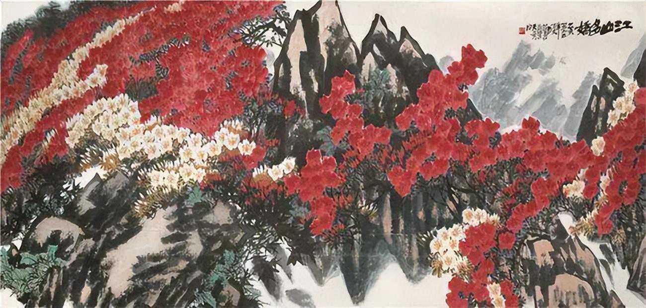 一般来说,为天安门城楼中央作画,会以山水画为主要表现题材,而庄寿红的《江山多娇》则选择气贯长虹的杜鹃花作为画面的主体,吸取山水画的画法,突破传统折枝花卉的局限,以酣畅淋漓的笔墨和妍丽的色彩呈现山野生长的杜鹃花蓬勃旺盛的生命姿态,表达了新时代的强健精神与对美好未来的坚定展望。《江山多娇》是庄寿红花鸟与山水相结合的代表作之一。