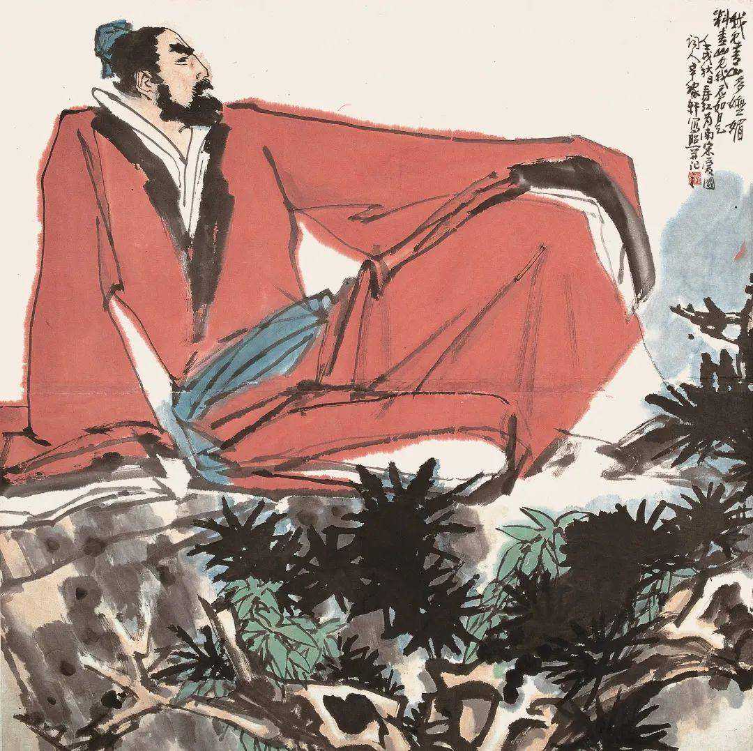 辛弃疾一生坚定抗金,外界的百般挫折难凉其爱国热血。画中的诗人在岭上就岩石而坐,姿态沉稳豪放,人物衣着大面积的红色涂染、桀骜不驯的神情,彰显出他愤慨的内心世界与骄傲坚毅的品性,充分展示他深沉的爱国情怀,观者能与他的心境产生共鸣。庄寿红吸取了辛弃疾诗词的雄奇豪阔,笔墨不琢细节,着意于人物的精神世界,形成奔放豪宕的风格,在作品中寄托浓厚的爱国之情。