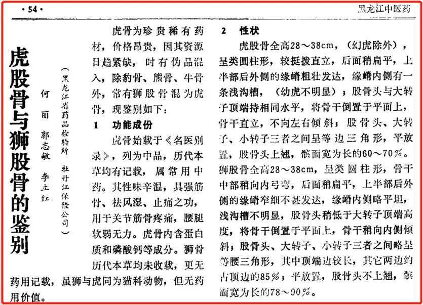 《黑龙江中药》杂志1992年第4期上有一篇文章叫《虎股骨与狮股骨的鉴别》,提到虎骨是珍贵药材,然而资源日渐紧缺,经常被其他动物骨头假冒,其中包括狮骨。然而很遗憾,此文没能鉴别两者在成分的不同,而是从外观上加以区分。恕陶医生愚笨,看了半天,发现虎股骨与狮股骨非常相似,肉眼几乎无法区分。