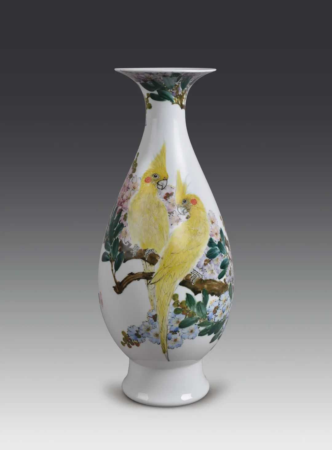 关兰作品鹦鹉紫薇长颈喇叭口瓶高55.8cm