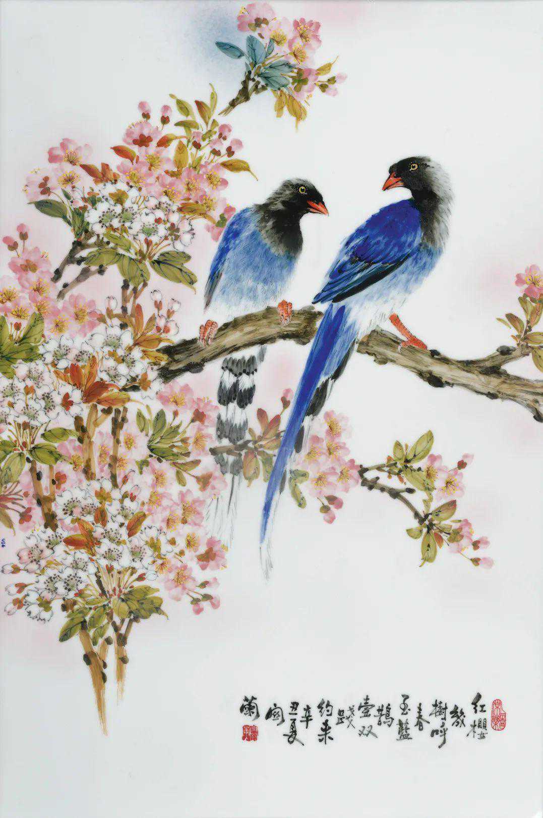“纸画和瓷画非常不同,除了将制瓷的工序一样样学习,在画法上我也在不断调整适应。”关兰以岭南画派撞水、撞色的小写意花鸟技法入瓷画,还将现代绘画观念融入,以凸显瓷器色彩。