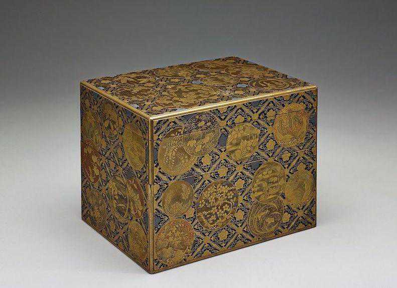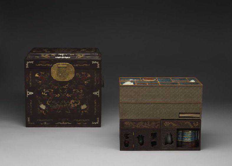 “百什件”特别之处,在于将小古玩以藏宝概念收藏,而“百什件”的外箱也给人赏心悦目的感受。当时流行以漆盒为外箱,这里有两种:一是用金、银漆绘制图案的日本莳绘漆器,一种是刻划在器物表面,填上金漆的传统戗金漆盒。