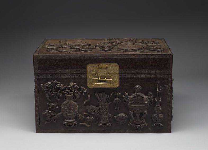 紫檀博古图长方匣外盒以紫檀木精细雕刻各种古玩的博古图为装饰,打开后看到以紫檀木作内屉,屉的上缘浅浮雕填金四季花,长边上有浅浮雕鹿、鹤图,象征鹿鹤同春。