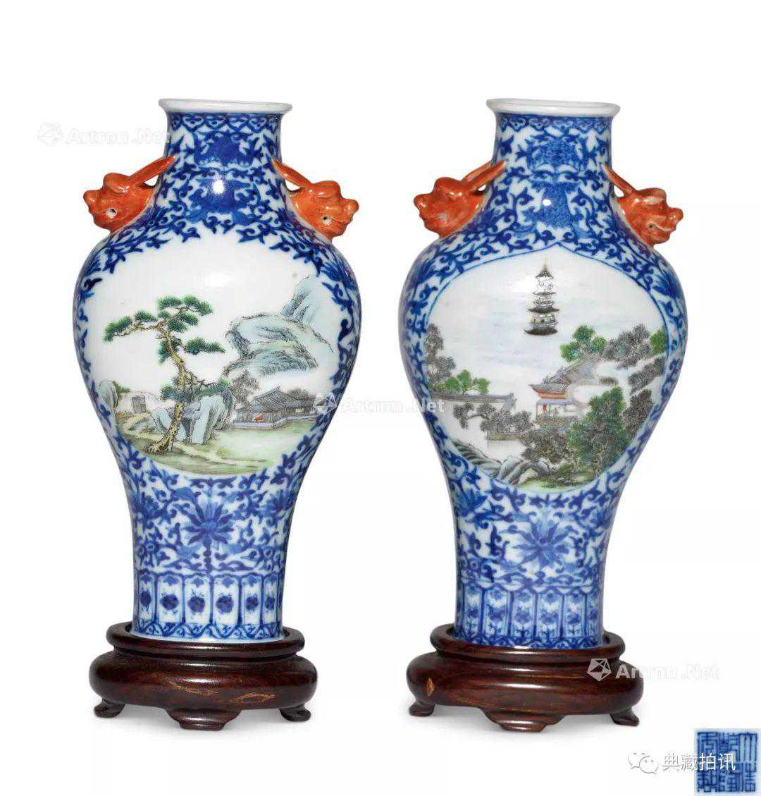 说明:大屏敞口、束颈,下接四方直肩,直腹下收,方圆有致。肩下缀二虎首衔环。大瓶内口绘梅花,盘旋圆口之中,布局绝妙。颈部绘山石花鸟,花枝俏丽,花朵用色温柔,点缀枝头,春意盎然,禽鸟栖于枝头,神态生动。腹部两面绘山水、两面绘花鸟。其中两幅山水,用色层次丰富,远山近水,岸边高士闲坐,山中亭台掩映。画工满密而画意舒朗,尺幅千里,构图水平极高。另外两面的花鸟,用色精彩,细节绘画栩栩如生,写生花鸟,与写意山水聚在同一作品中,艺术水平不相上下,雅俗共赏。从绘画角度看,绝不输几位著名的浅绛彩画家。瓶身四面有款。面一为“但识琴中趣何劳弦上音。玉泉”并印;面二:“竹外一枝斜更好。丙戌夏三月,研生写于珠山客次”,并印;面三:”得意杨帆。玉泉”,并印;面四:”未有信天翁,日暮秋江上,玉泉”。研生玉泉款瓷器,十分少见,玉泉(研生),生卒年不详,活跃于光绪年间,作品少见,目前面世作品仅见两件,其一为这件来于欧洲的天圆地方大瓶拍品,其二为英国东方陶瓷研究会长彼得·韦恩先生的旧藏—丙戌夏研生玉泉写山水大瓷板,瓷板收录于《等待春天》一书的封底,彼得·韦恩先生是最早研究中国浅绛彩瓷器的专家,他曾经专程到中国追寻浅绛足迹,为了专题研究,买了很多浅绛作品并收录于《等待春天》一书,其中不乏程门、王少维、金品卿三大家的作品,而韦恩先生独将研生玉泉的瓷板作为封底,足以说明玉泉作品艺术成就之高,从本件拍品的高超画意中也可以充分说明。