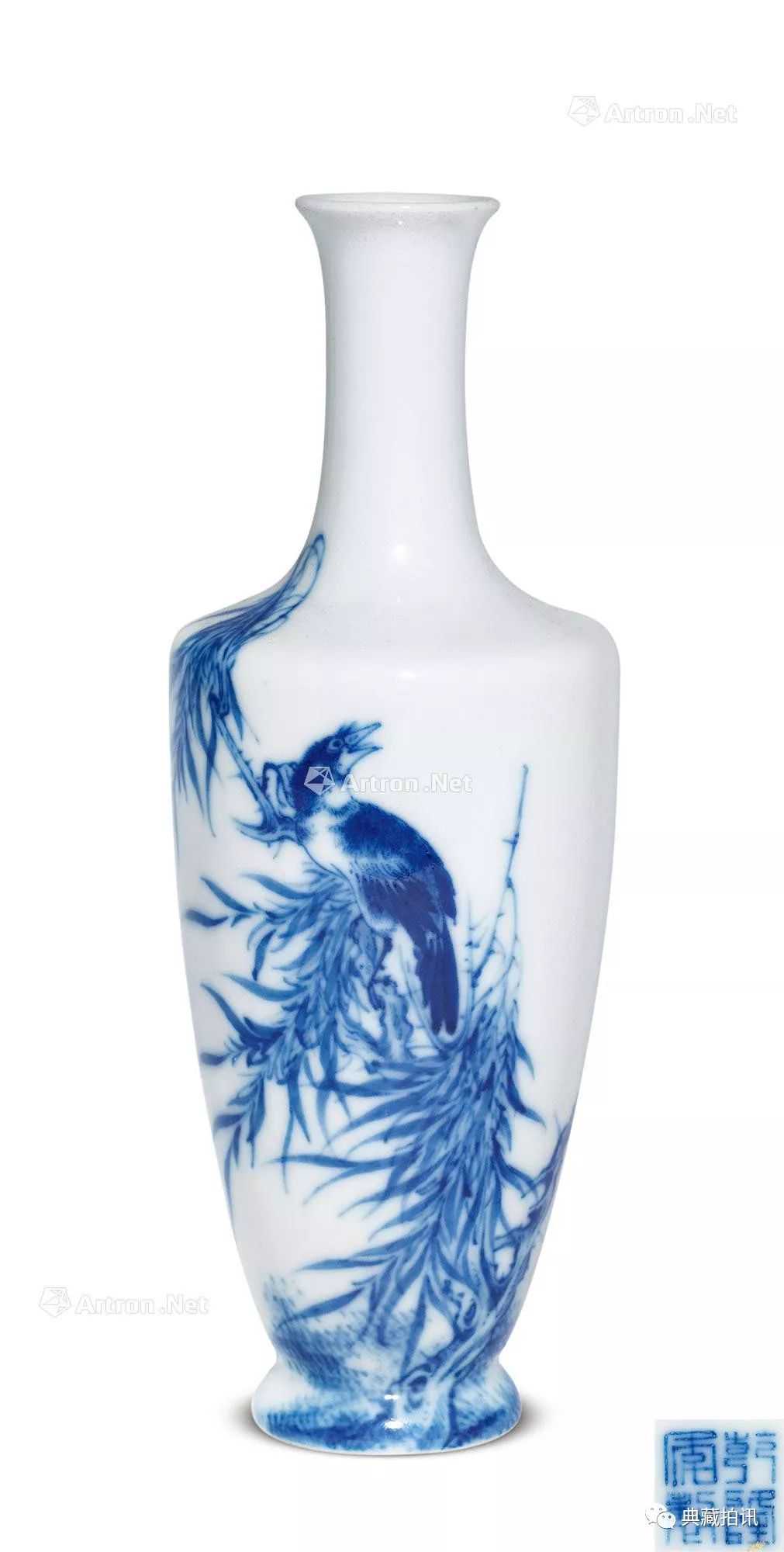 说明:该拍品口沿处以青花描绘边饰,腹部绘有花鸟纹饰,线条流畅,形同中国水墨画。