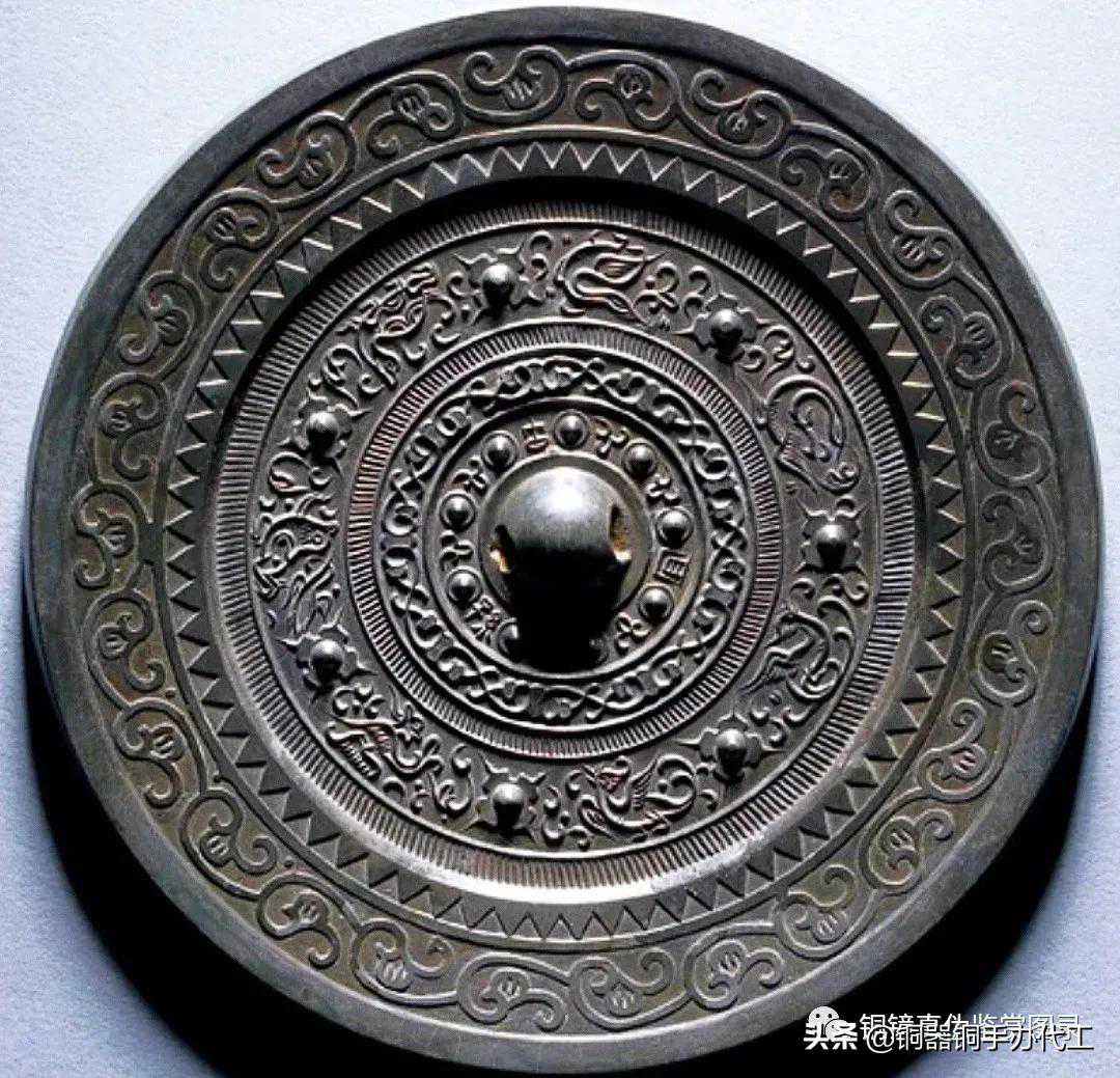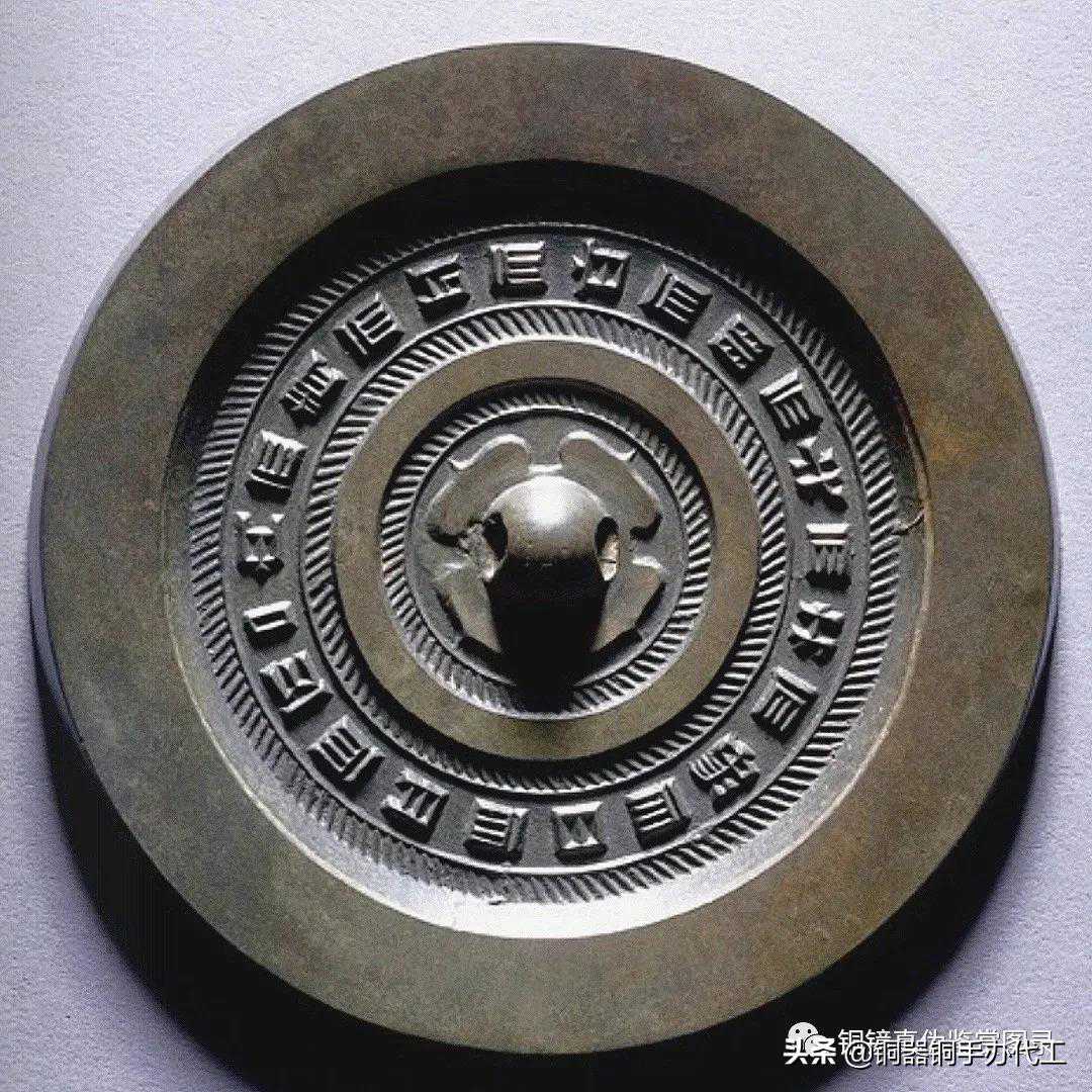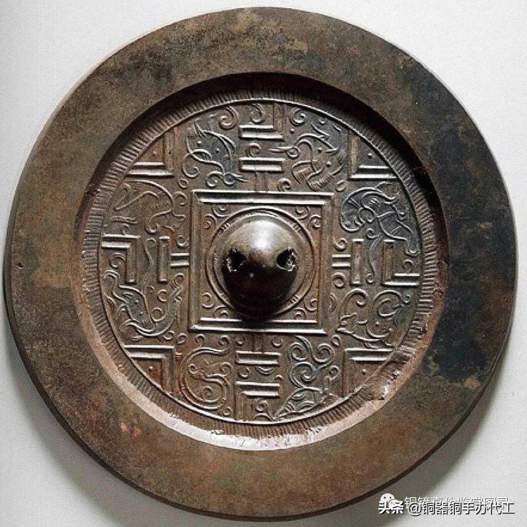 镜光气莹亮,打磨精细,钮外配饰内连弧纹环带,主纹饰为点线结合的几何纹。