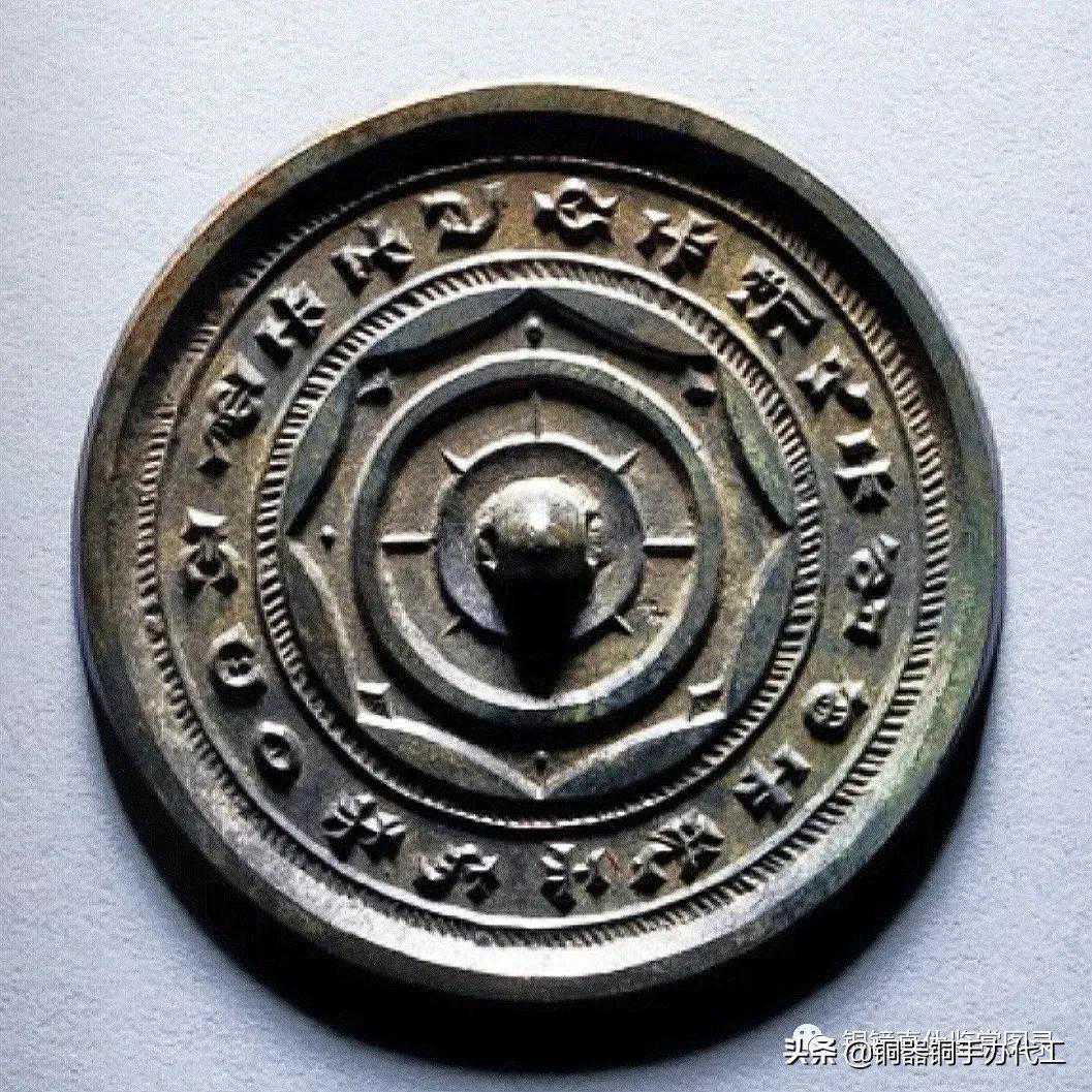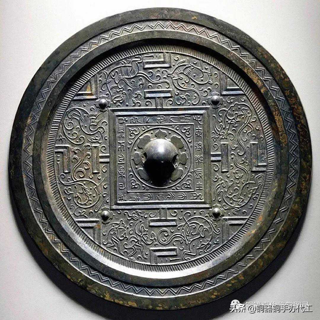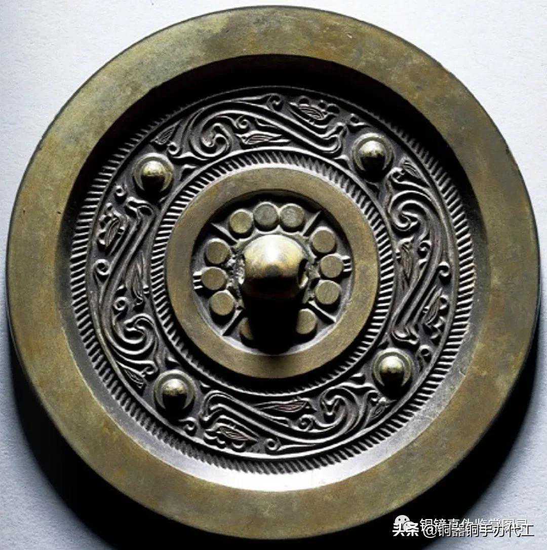 镜光气莹亮,打磨精细,钮外配饰内连弧纹环带,主纹饰为点线结合的几何纹。