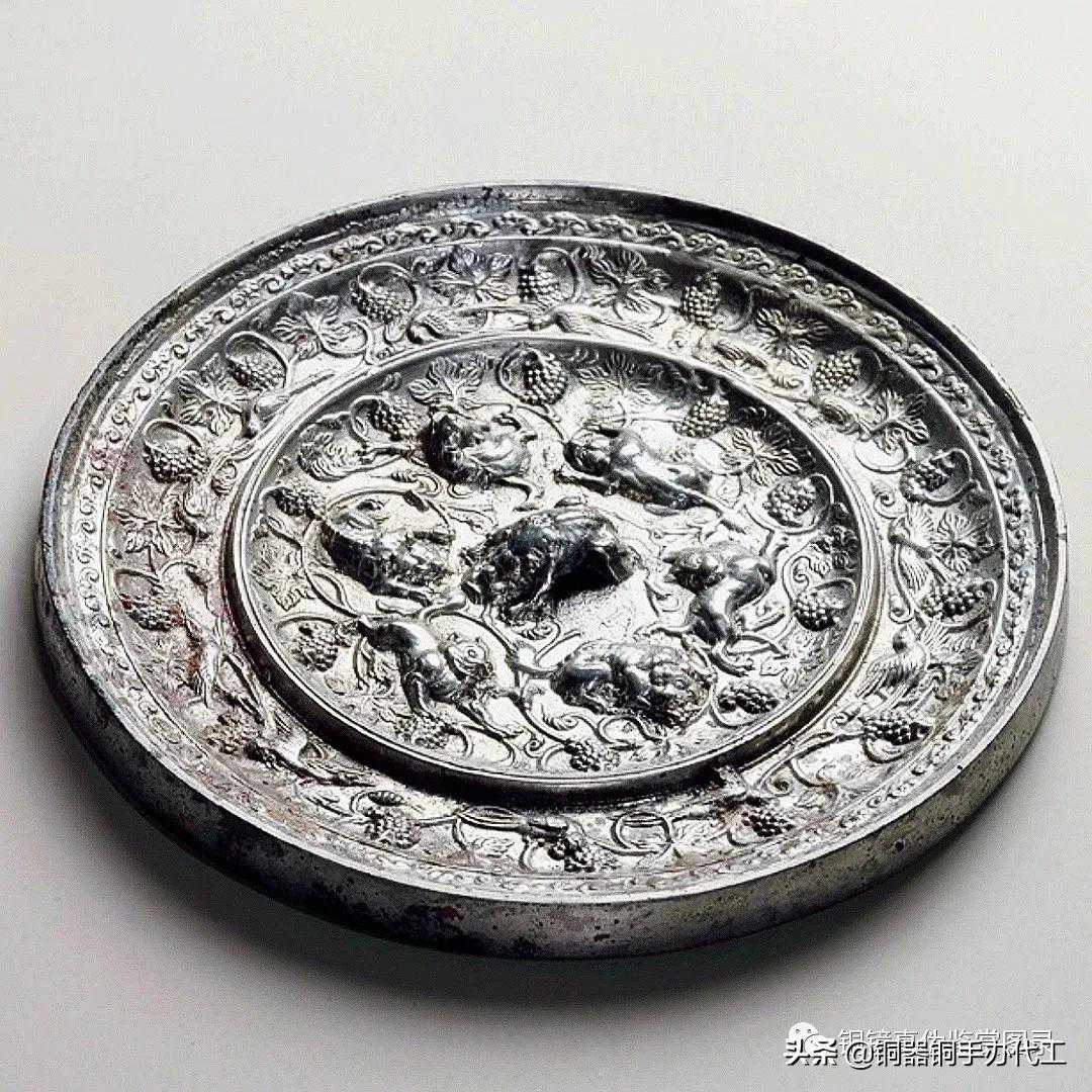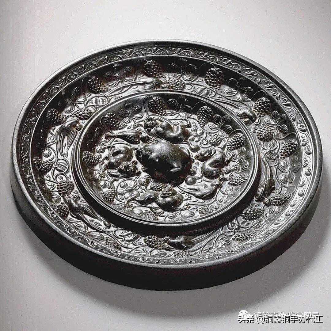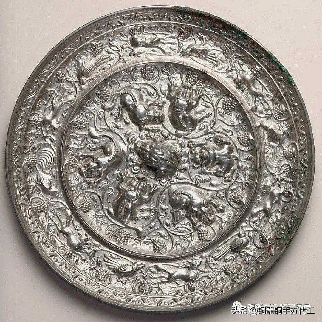 镜光气甚佳,尺寸大而厚重,有修。双弦纹高圈将镜背分为内外二区,内区高浮雕八只在葡萄叶蔓之间嬉戏的瑞兽,造型似狮,两两相对,环绕镜钮。瑞兽间饰以葡萄枝蔓。弦纹高圈内饰长短两周锯齿纹。外区饰瑞兽、鸾鸟和葡萄枝蔓相间环绕,镜缘处饰缠枝花卉纹。