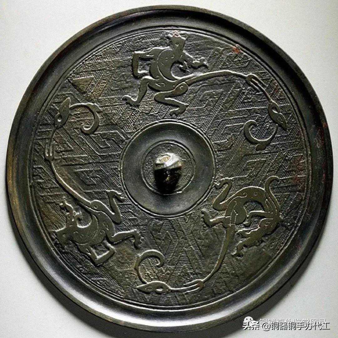 镜黑漆古,纹饰浮雕,动物纹缘,冲线。