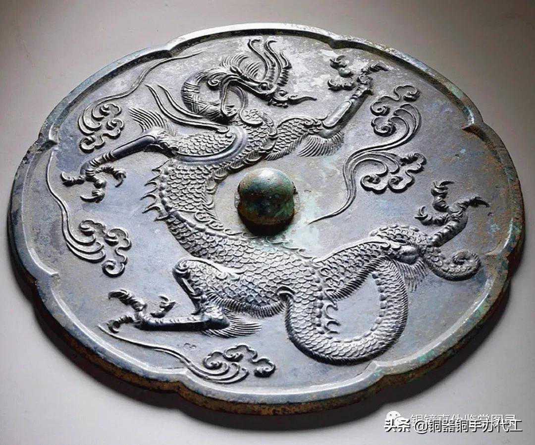 镜黑漆古,八出葵花形,圆钮,主纹饰为浮雕高耸威猛的立龙,巨龙四爪舒展,张口吐舌,霸气十足。围绕巨龙环饰四朵流云纹,线条飘逸,龙鳞龙爪刻画细致生动。