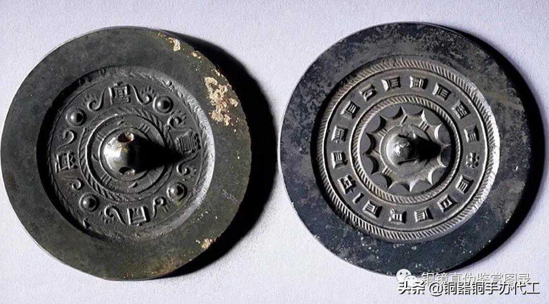 弦纹镜一对,形制不同,保存完好,品相甚佳。