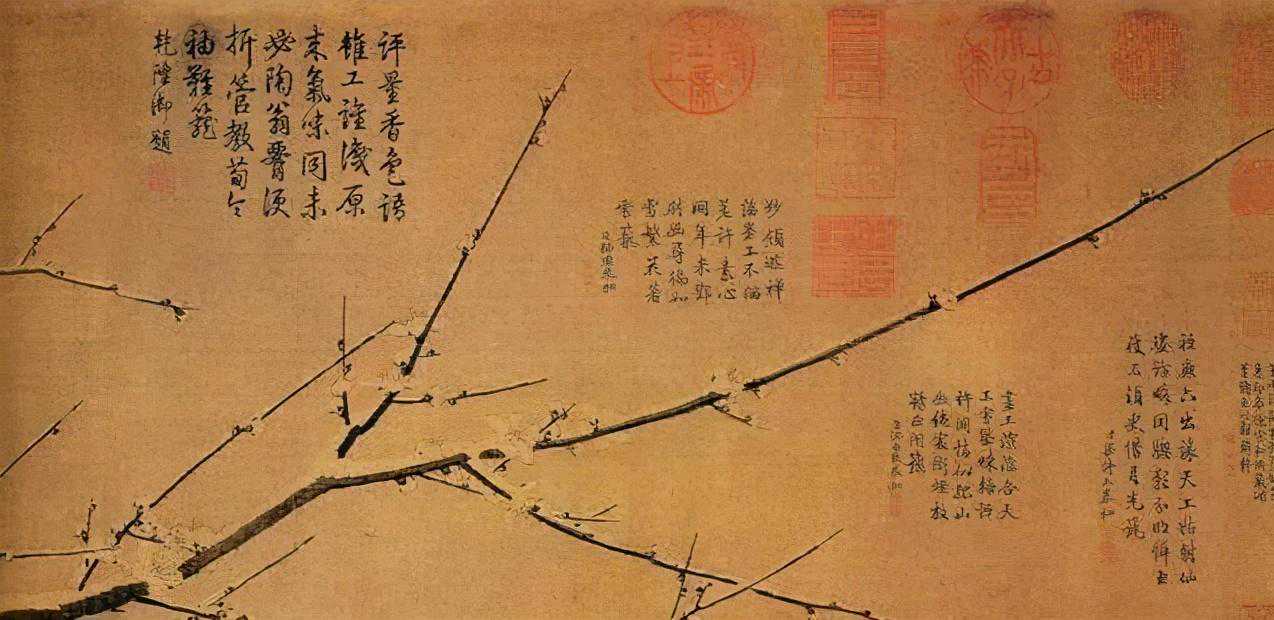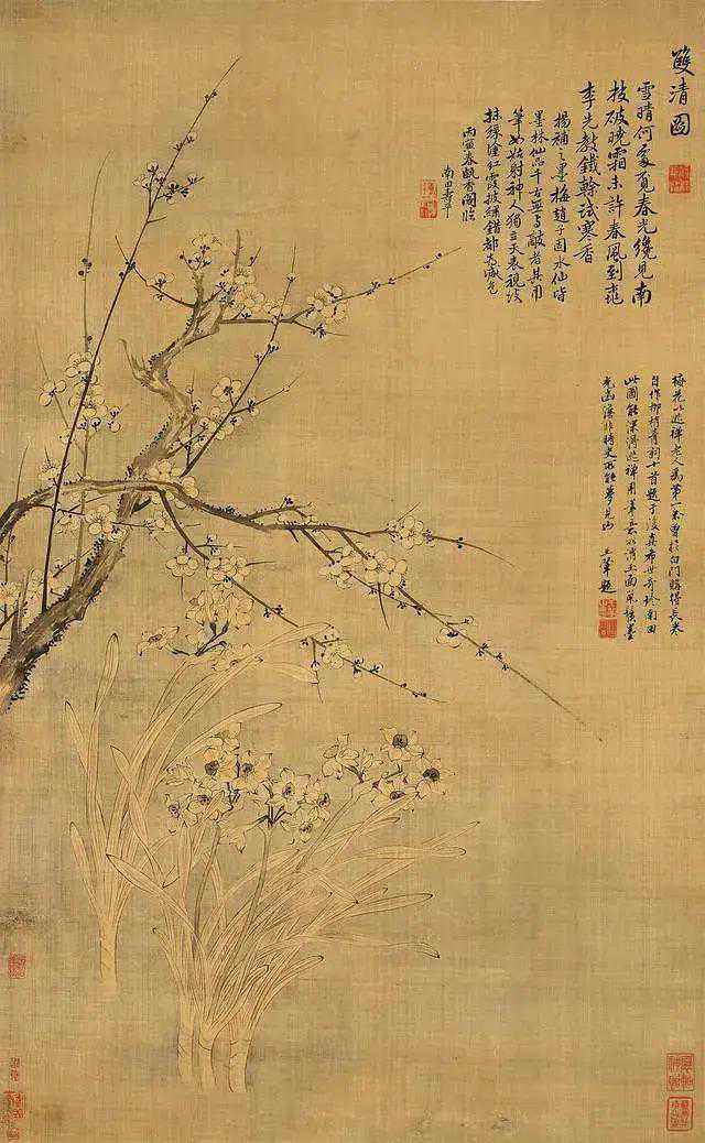 元代画家王冕善画梅,创繁梅之格、红梅之制、雪梅之体,均别开生面,美不胜收。王冕传世的梅花作品有很多,在他的一幅《寒梅图》上,有一首自题七绝这样写道:“一树寒梅白玉条,暖风吹乱雪飘飘。孤山处士情如故,谁载笙歌过断桥。”诗意婉曲,既吟咏了画中寒梅被狂风吹落花瓣如雪花纷扬的情景,同时又借有“梅妻鹤子”之称的孤山处士林和靖爱梅成痴的典故,来称赞作者画梅技艺的高超。“和靖门前雪作堆,多年积得满身苔。疏花个个团冰玉,羌笛吹他不下来。”这是王冕《南枝春早图》上的题诗,前两句直观地刻画了林和靖在家门前所植的一棵满身苔藓的老梅树傲然立于积雪中的情景,后两句则歌颂了“临寒独自开”的梅花永不凋谢的可贵的“岁寒心”。画意与诗意相融合,赋予了冬天不凡的寓意。