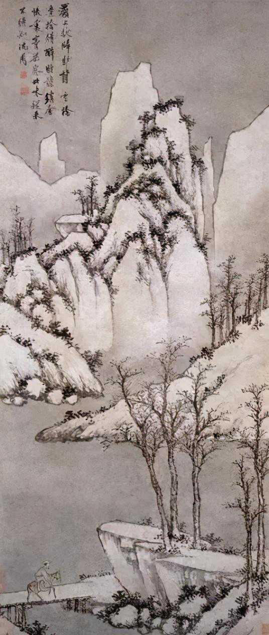 明代吴中代表性画家沈周画过一幅《灞桥风雪图》,取材于唐代著名山水田园派诗人孟浩然骑驴于灞桥风雪中寻梅有感而吟诗的场景。画面上群山素裹,积雪盈途,掉光叶子的冻树兀立于凛冽的寒风之中,一戴笠老者(孟浩然)骑驴过桥,一派萧瑟荒寒的冬日风光跃然纸上。画家在画左留白处特意题诗一首:“灞上驮归驴背雪,桥边拾得醉时诗。销金帐里膏粱客,此味从来不得知。”此诗刻画了醉中的孟浩然骑驴行走在灞桥的大风雪中,忽有所感而拾得佳句,口吟成诗。虽然对冬日景物没有精心的描述,却以那些豪门富家的膏粱子弟根本体会不到置身于风雪中的那种快意,来反衬冬季大自然皑皑雪原的神奇美丽,以及诗人的灵感来自于风雪中的独特意趣,读来令人赏心悦目,心生一份如诗人般踏雪寻梅的美好向往。