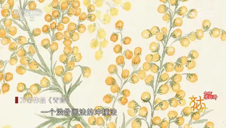 工笔花鸟画家上海市文史研究馆馆员万芾:我们看看这幅,这幅应该我们很熟悉的一味中药材就是人参,看了中药这么美丽的花,这么有生命力的现象,是不是我们吃的时候也不苦了。