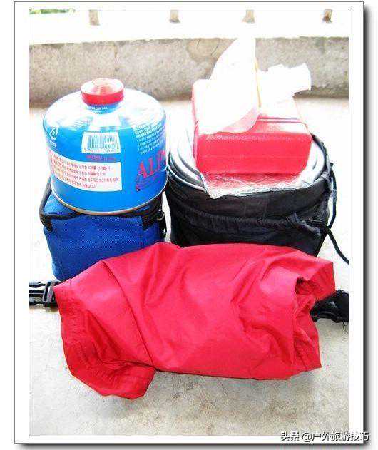 如气罐、炉具、炊具(套锅)火种、转换器、挡风板、水、食品等。个人把这些物品通常进行分袋归纳整理装包,一个整理袋装套锅、餐具、炉具、气罐等,另外一个食物袋装火种和分包配备好的食物、饮品、调味包等。