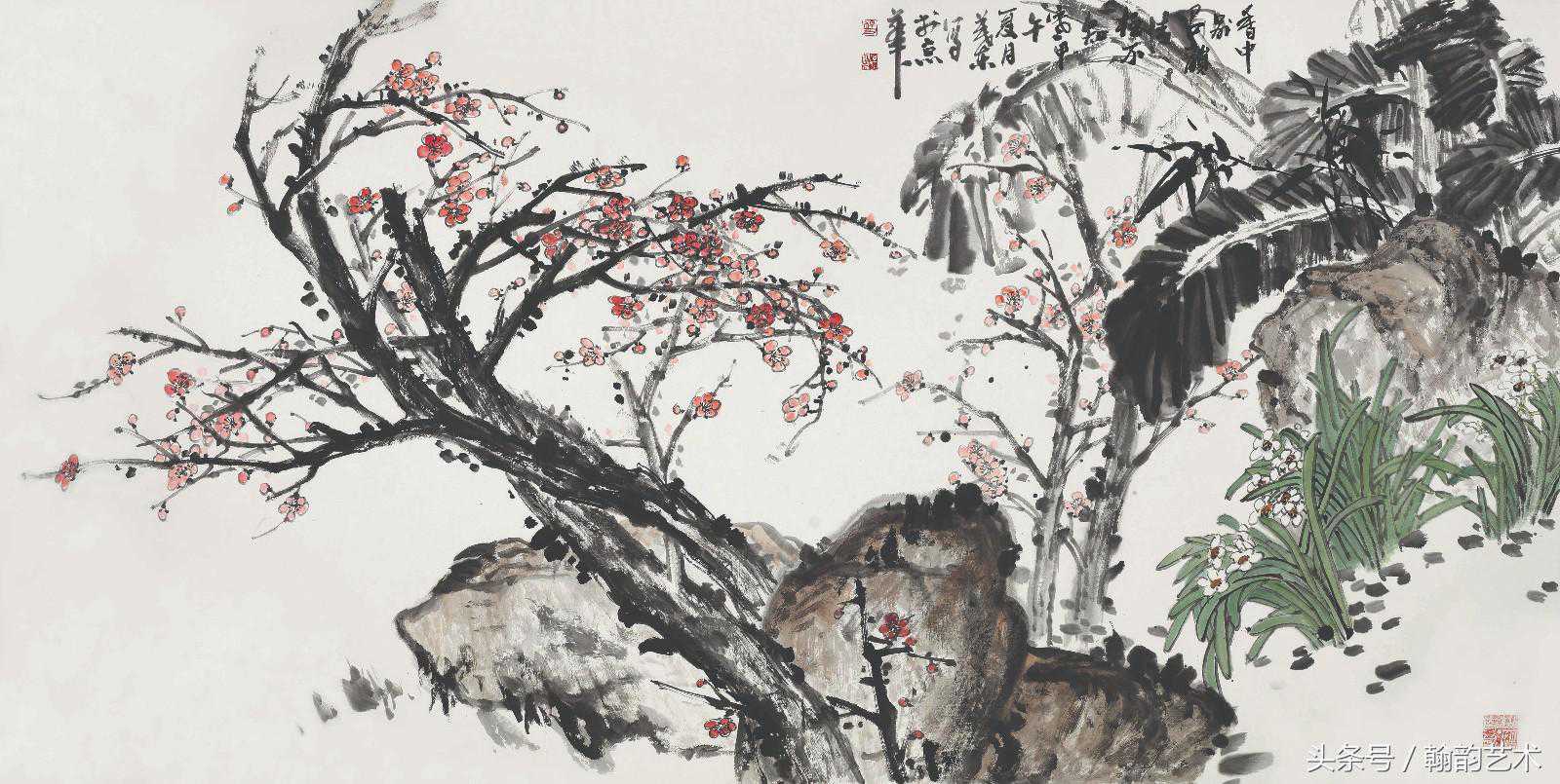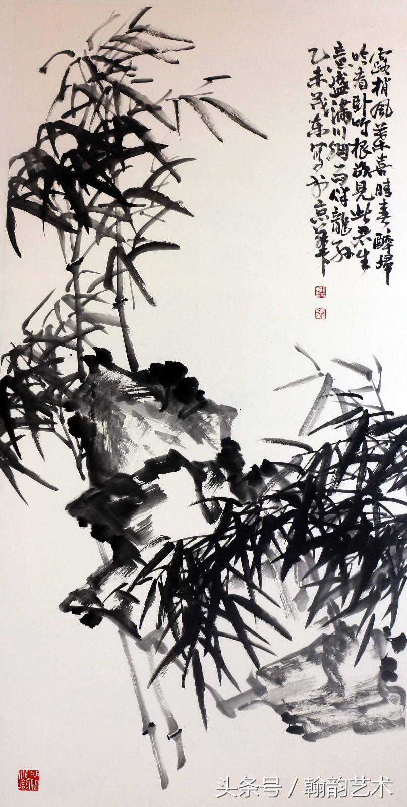 宋元以降,江南文人以“四君子”为风尚,由此开启了文人写意画的大幕。尤其元代,赵文敏、倪云林、吴镇、王冕……,梅竹画家几乎各尽其极,不独于笔墨,也在为人与体道方面树立了千载风标。我们可以想象,徜徉于山林之间,梅竹掩映,“清风一披拂,雅韵互相答”,这样的诗意生活,于诗于画,皆是无上妙境。杨茂东的梅竹,也应是在这样的诗意追想中完成的。如他的《潇湘风雨》、《独俏一枝春》等等,笔墨与意境相映而妙合,堪称佳构。在《潇湘风雨》中,竹叶与细枝爽利的用笔,似可听到戛摩有声的山林天籁。而纸质中洒金点的巧借,也使风雨意象更为真切。石头的泼墨与竹叶组合中涨墨的运用,更强化了这一意象。在《独俏一枝春》中,梅树老干的用笔苍润浑厚,小枝用笔干湿自然,使整幅画生机跃动,写出了春气潜升的气息。由此可见,他长期生活于江南,在日常晤对中,梅竹之象已深入于心,拈笔写来自然形神俱得、意境真切。