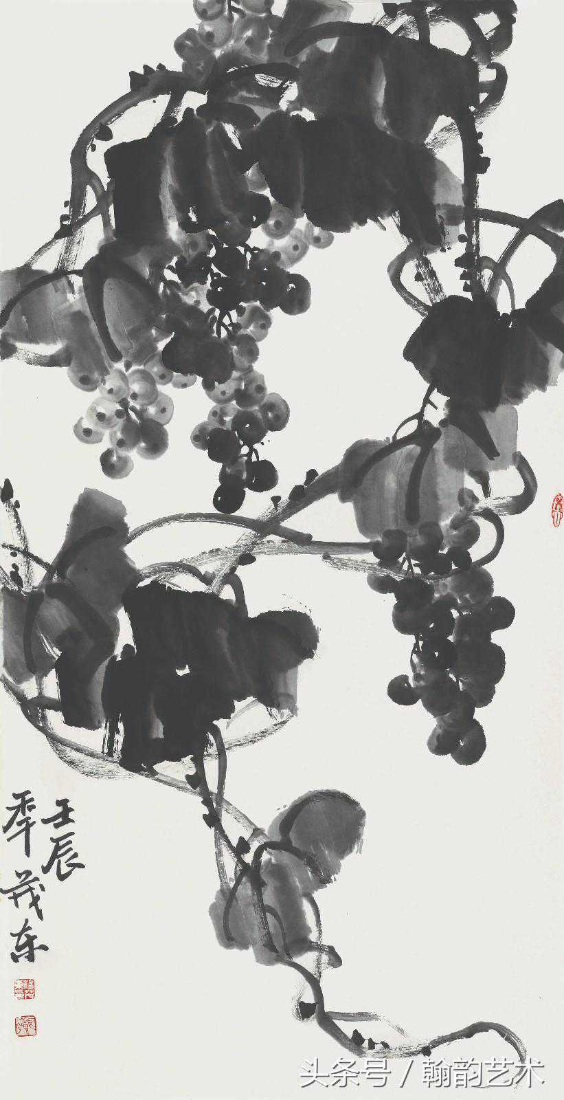 杨茂东的绘画题材,当然不限于四君子,毕竟以他的专业素养和笔墨功底,无论临古或是写生,皆能随手成章。如他画的紫藤、葫芦、葡萄等,藤蔓遒劲的用笔,足见其对书法入画的理解。他还擅画大画,其用笔之壮硕、气魄之雄肆,亦可见其胸襟之开阔。他画的《清极不知寒》等数幅巨作,有吴昌硕式的浑穆气象,从这些作品中,也可看出他对因势用笔,以及对于章法布白的把控能力。