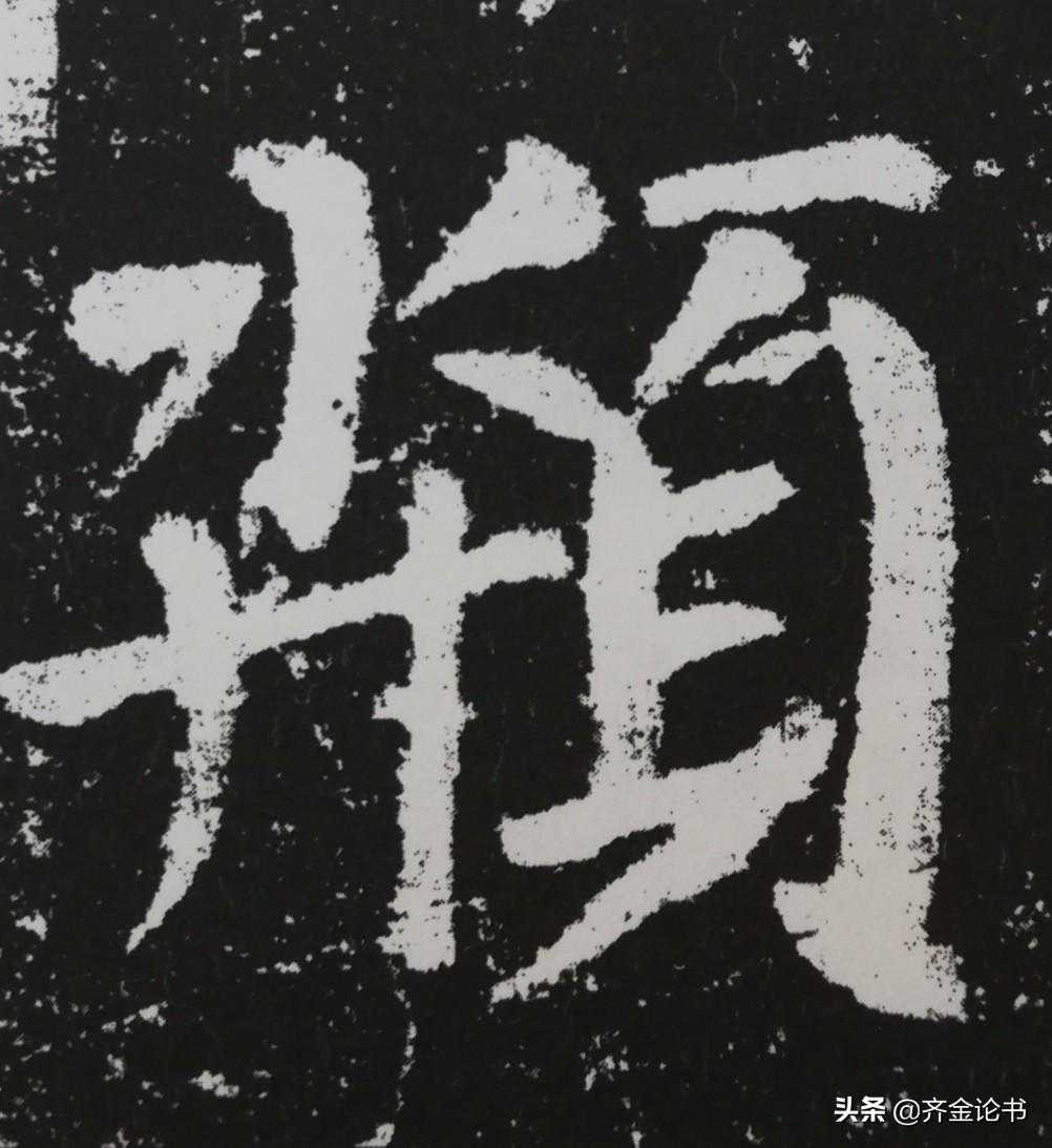 顿折里面有一种比较特殊的就是魏碑的折笔,它方整宽厚,写法与唐楷不同,具体操作起来是这样的,写到转折处,提笔,然后重顿,这时笔不要动,把笔杆往右倾斜,用腕力往左下方转笔,待笔锋调整到位后,往左下行笔即可。