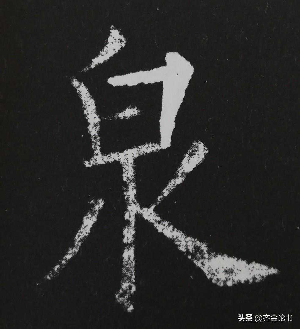 内圆外方的转折,是清朝碑学大师张裕钊的独创,这种写法也是他书法当中的关键笔法。具体写法是这样的,写到转折处,提笔顿笔,然后顺时针捻动笔杆,写出里面的圆弧,然后向下行笔即可。要点是,顿笔,是为了写出外面的方角,所以转动笔杆时一方面是为了写出里面的圆弧,一方面是为了写出外面的方角,因此在注意里面的同时,也要注意外面的形状,要让外轮廓线是一条直线。