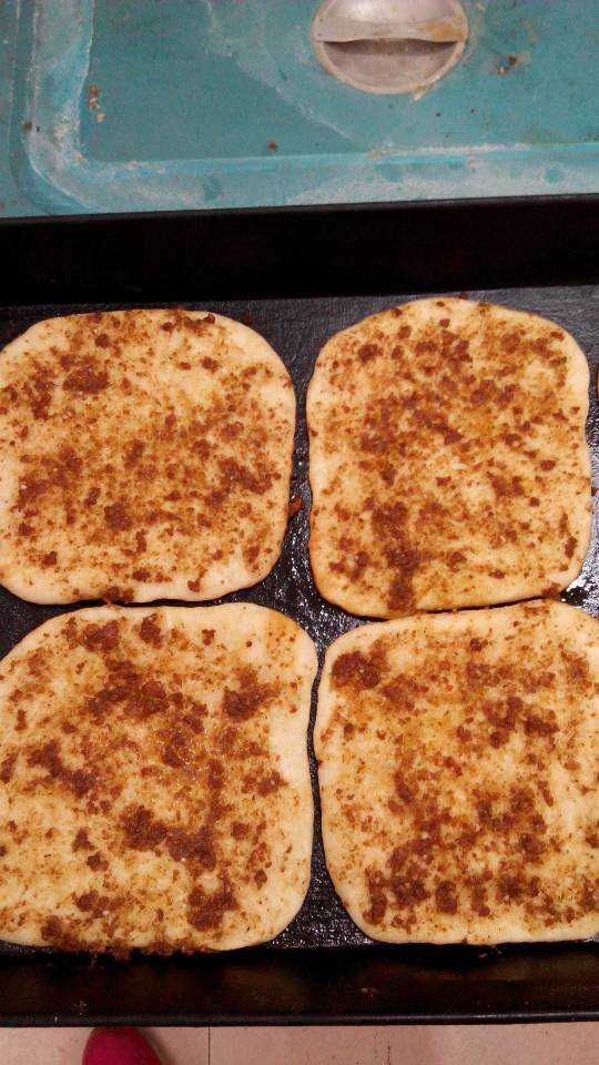 E:饼的烘烤:做好的饼放入预先购置的不锈钢托盘上,托盘上先涂一下油。一个托盘放六个饼,烘箱温度设置温度到300度左右,如果使用上下运载的烤炉,下炉调到300-320度,上炉调到280-300度。烘烤大约4分钟,刚开始自己经常拉出来看看,烘烤到面的表面有点发黄就可以了!中间如果看到有气泡把它弄破。