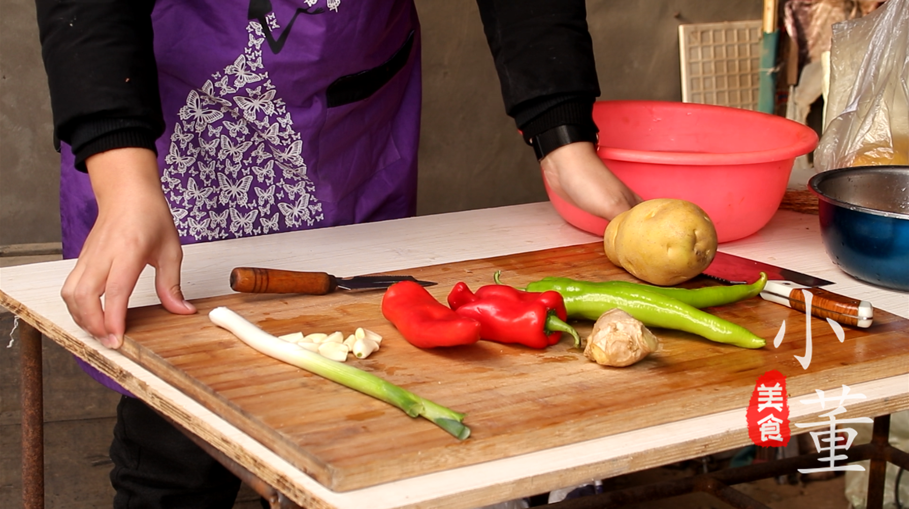 1、先将菜清洗干净,青椒去头去籽,切成块,红辣椒切成块,土豆削皮,切成滚刀块,放入清水中