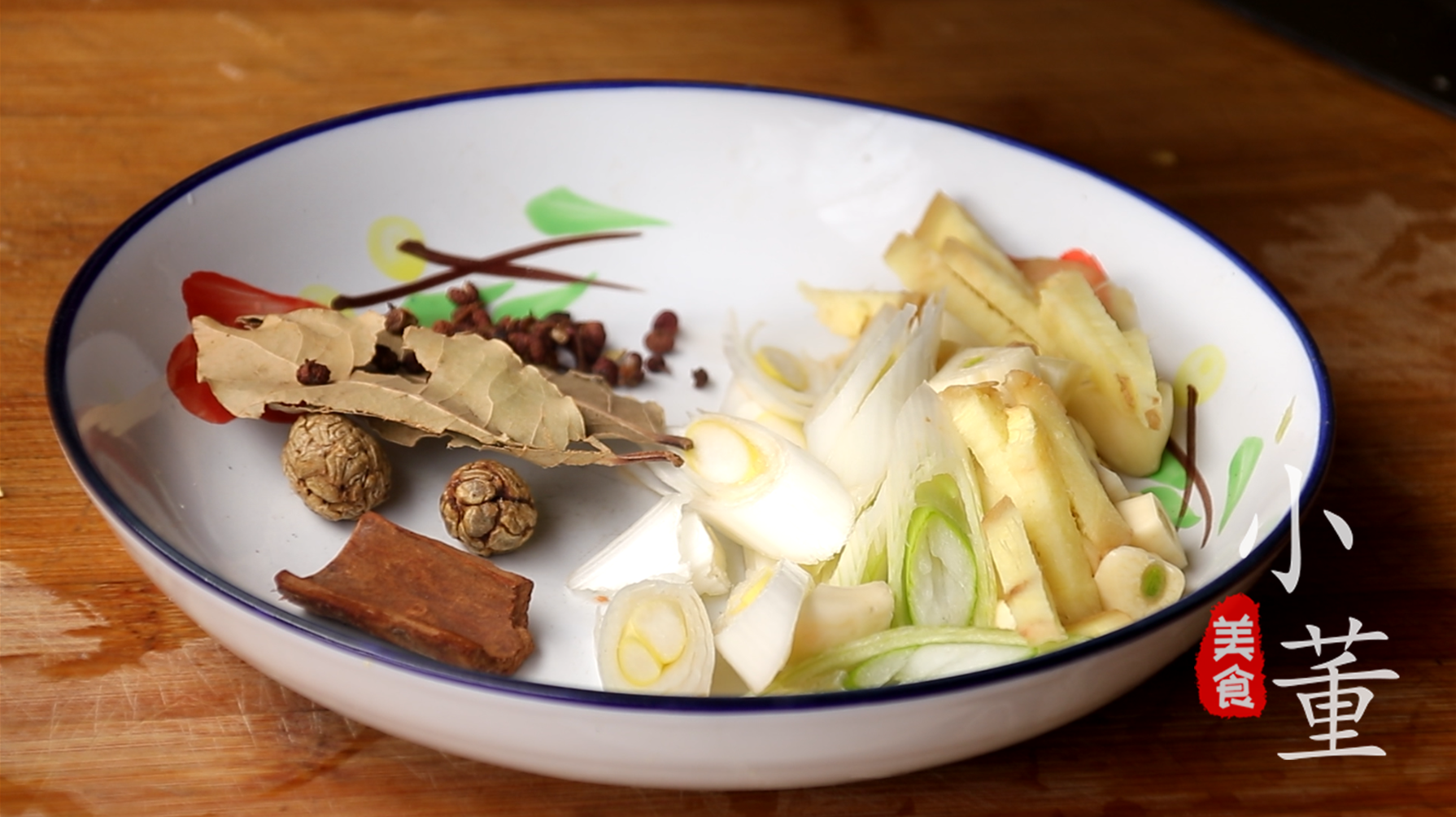 2、葱切成片,蒜切成块,姜切成丝,再准备点大料,桂皮,草果,香叶,花椒,八角备用