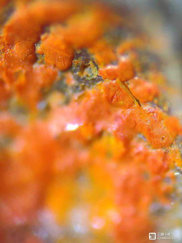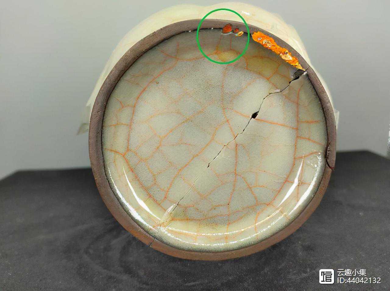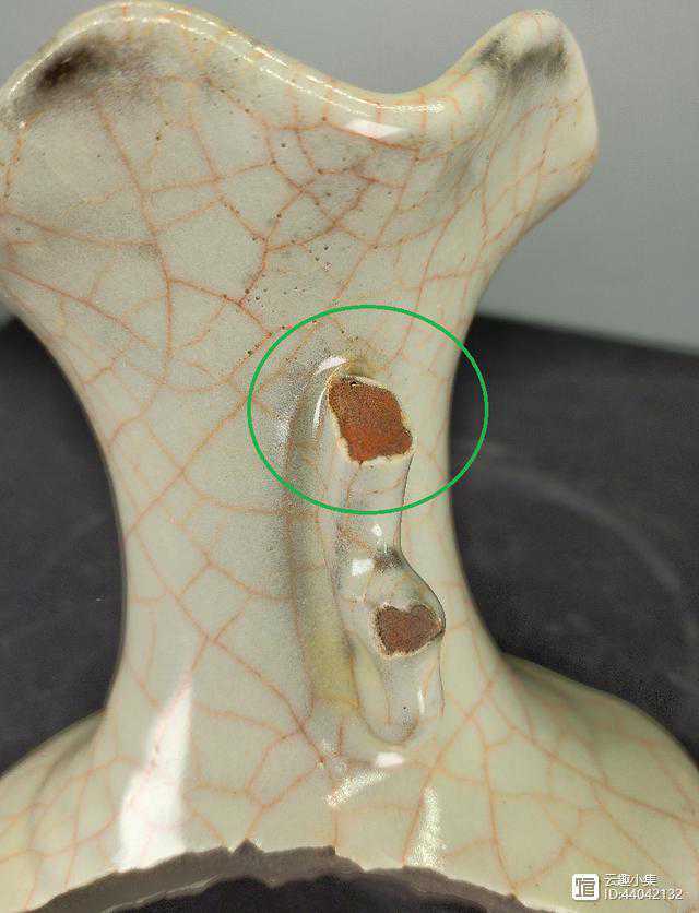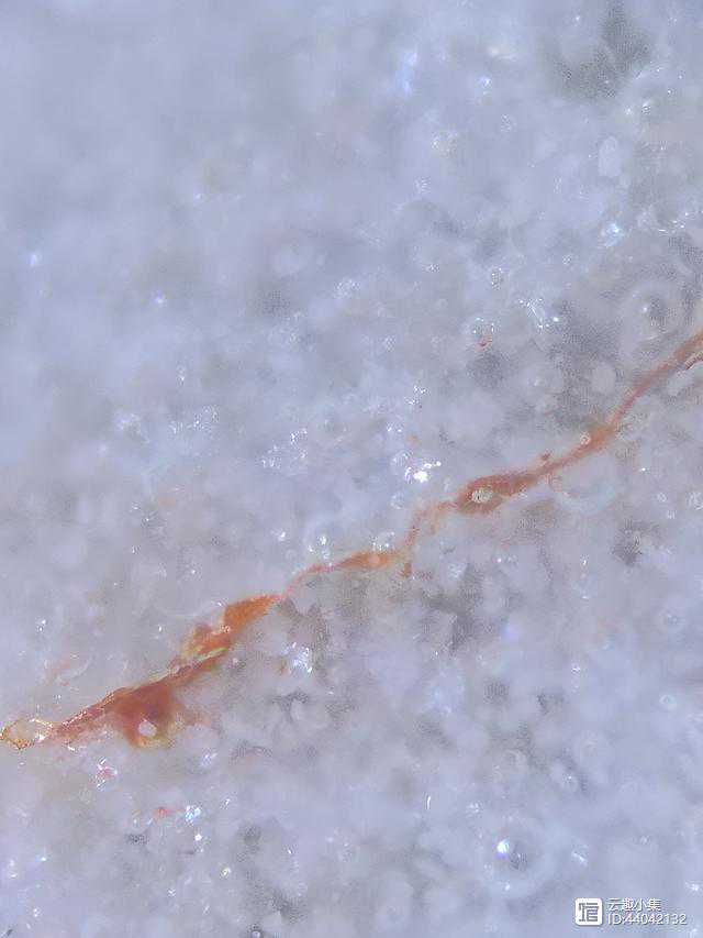 2、开片呈鳝血色,用显微镜观察,明显可见开片呈抖动弯曲状,这是经漫长的岁月慢速开片所形成的,与新仿的快速所形成的直、长开片有明显的区别。开片颜色浓淡不一,且浓淡之间有过渡,鳝血色状物从里往釉表面渗出。