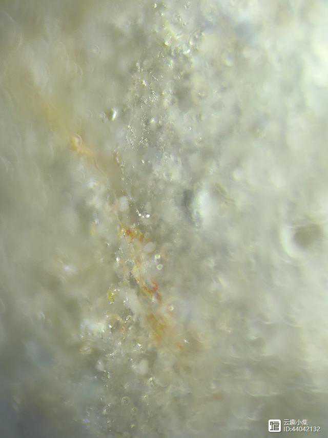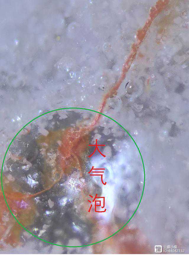 3、用显微镜观察,可见釉下气泡较小,相对较稀,但有少部分特大的气泡,与其它气泡相比大出上百倍,可见有变色气泡(有人叫死亡气泡)和破泡,釉下还可见大小不一的不规则的白色颗粒状物。