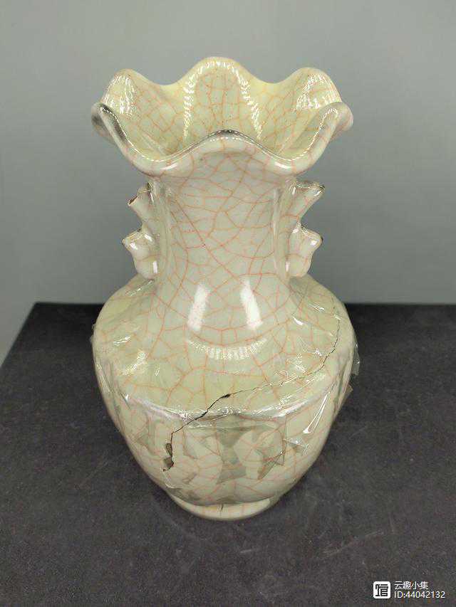 1、该花口瓶由四块残片拼接而成,但遗憾的是仍未能拼接完整,腹部尚缺一块,但四块拼接后,花口瓶的形制已十分显现。经测量,该花口瓶高约23.5厘米,花口直径约9.9厘米,底足外径约9厘米,腹部最大处直径约13厘米,花口呈六瓣,颈部有一对称的兽耳,腹部并非圆形,纵向有六条内凹沟,与花口对应将腹部分成六瓣状,底足稍外撇,紫口铁足。