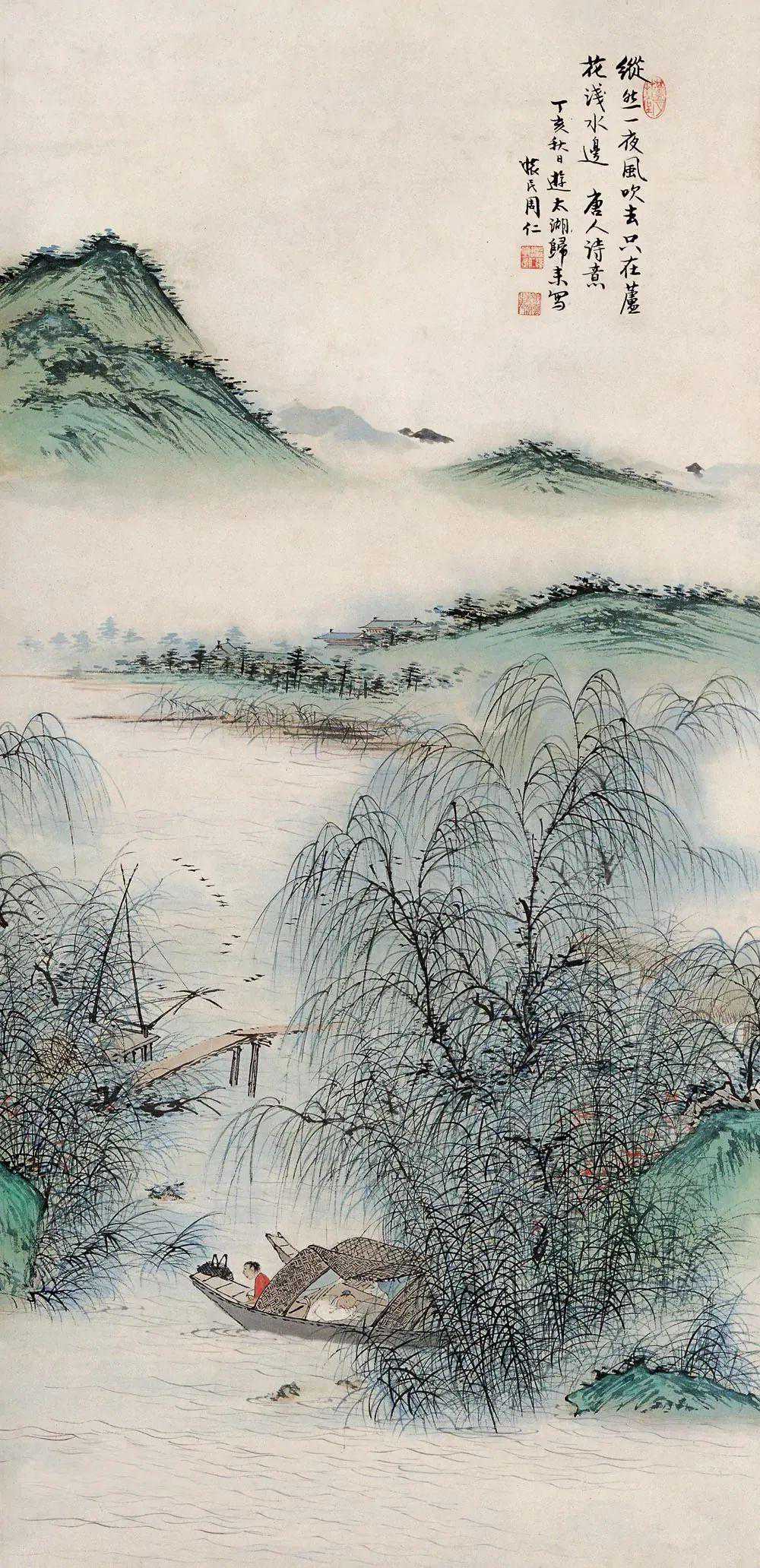 在周怀民山水画中,常常可以看到扶疏婆娑的太湖“芦荡”,其意境之美如红学家王昆仑所称赞“心随画笔到江南”,故他又有“周芦塘”之称。