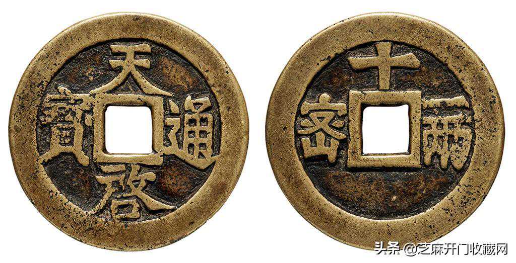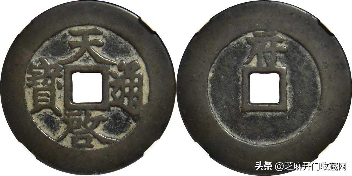 当时天启通宝有大、中、小三种形状,分别命名为折三、折二和小平。这其中最大的折三钱,以其上所刻字字体的不同,又分为楷书和篆书两大类。其中楷书的存世量已经非常稀少,鲜见美品,而篆书则更是稀有罕见。