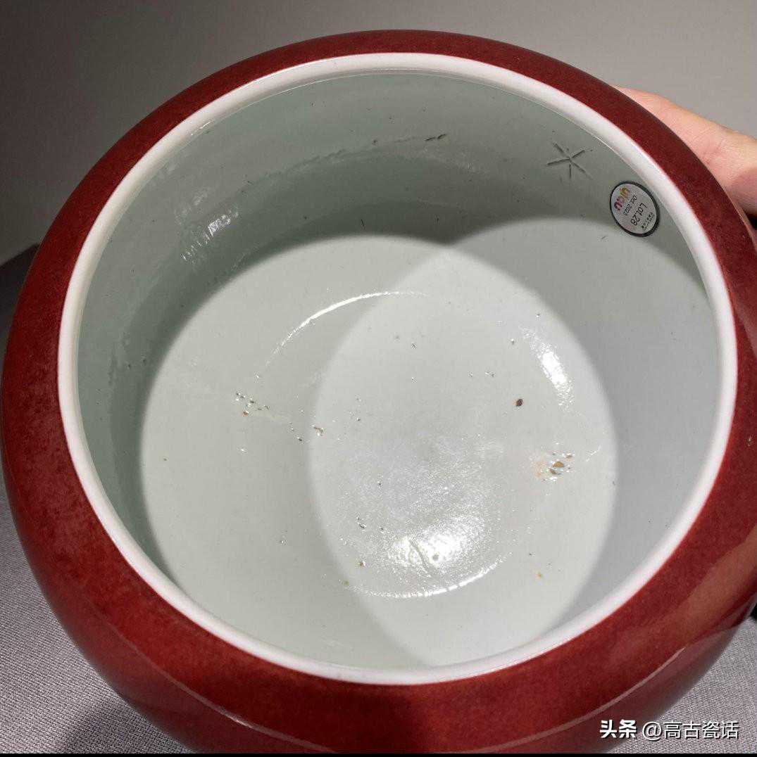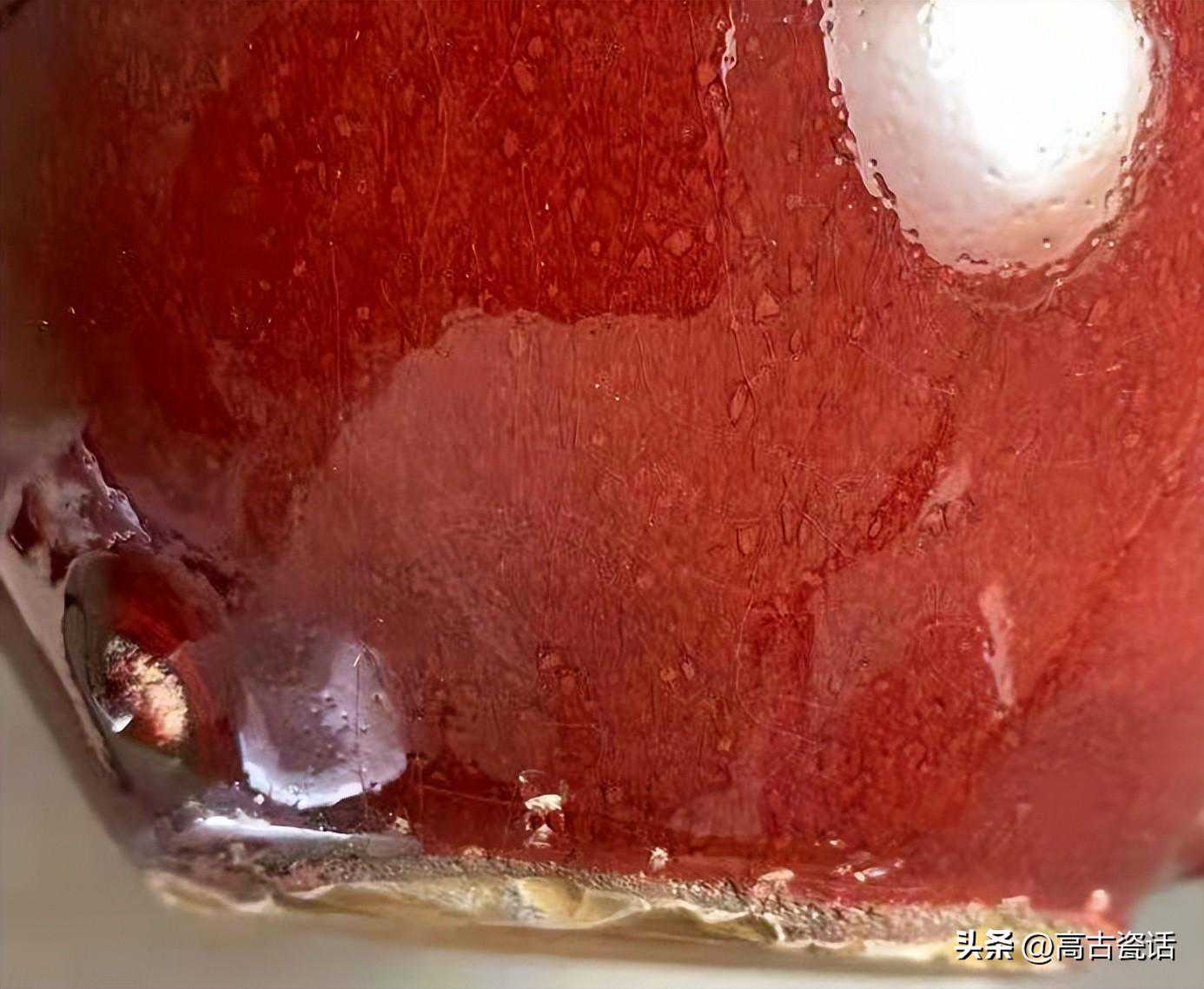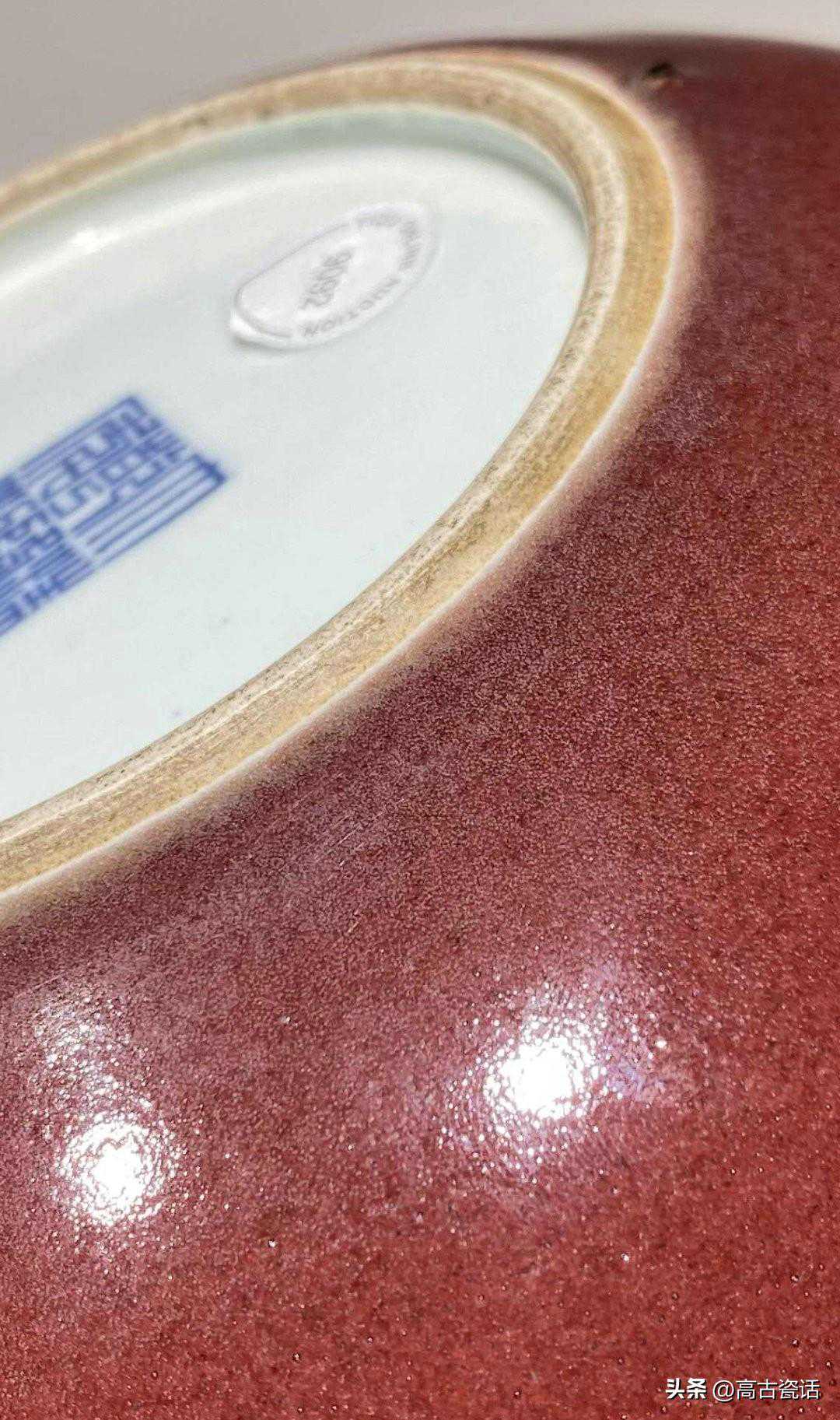 解说:我们看这件仿乾隆时期的红釉三足洗,就这件仿品而言,第一、洗内口沿下边点点红釉是吹釉留下的,这种高压气泵吹釉是解放后才开始有。第二、红釉釉色暗红发闷,釉质浑浊,不通透,反光湿黏漂浮,口沿泛黑,不是灯草口。第三、白釉灰暗,开片生硬,沁色在釉面,脏油腻。第四、底足胎质坚硬致密,表面潮湿,附着灰垢一致,粉尘油湿。与真品相比,真品红釉纯正通透,釉质细腻熔融,玻璃感强。灯草口泾渭分明,底胎干老,有长期使用的包浆老旧痕迹。
