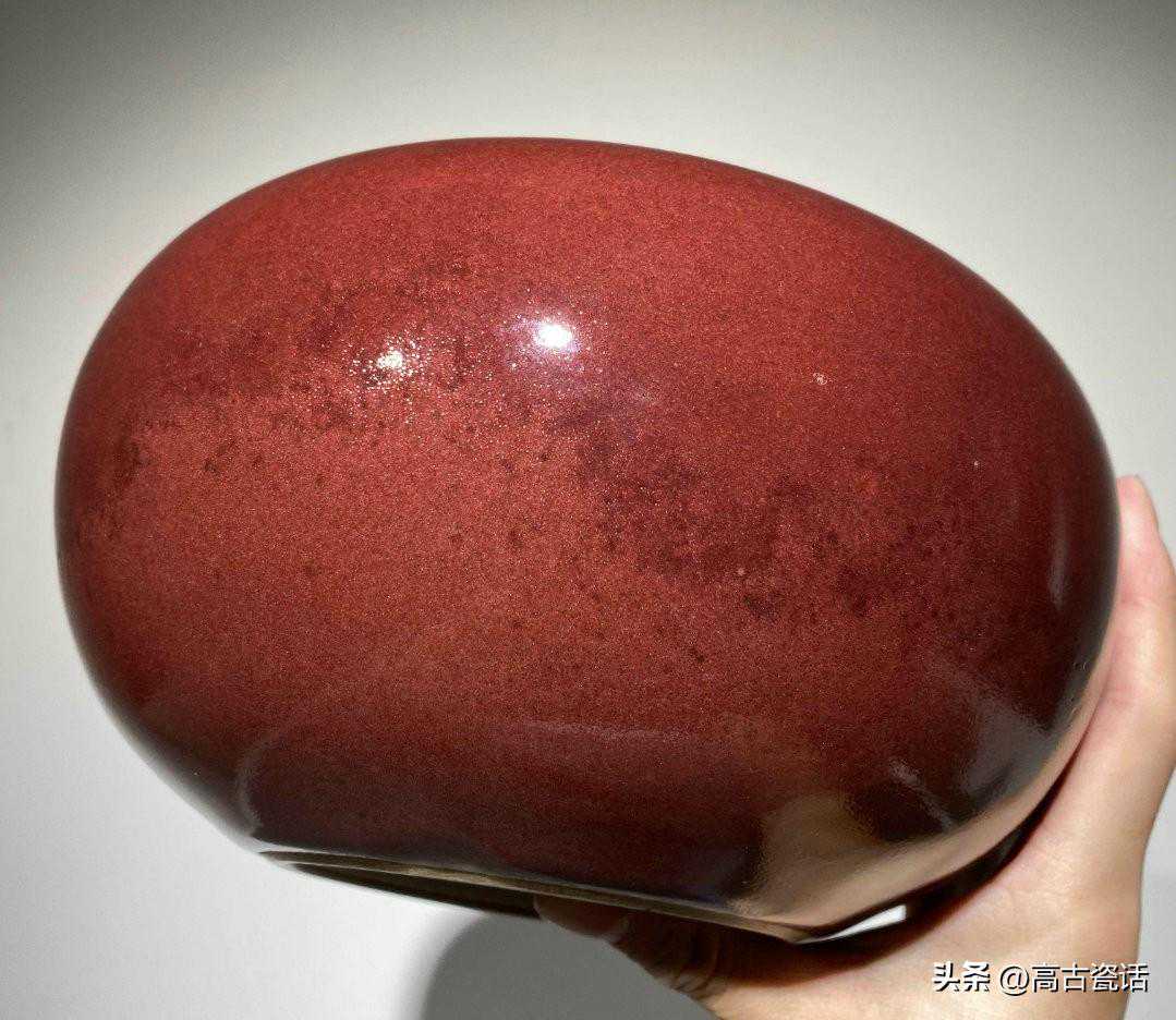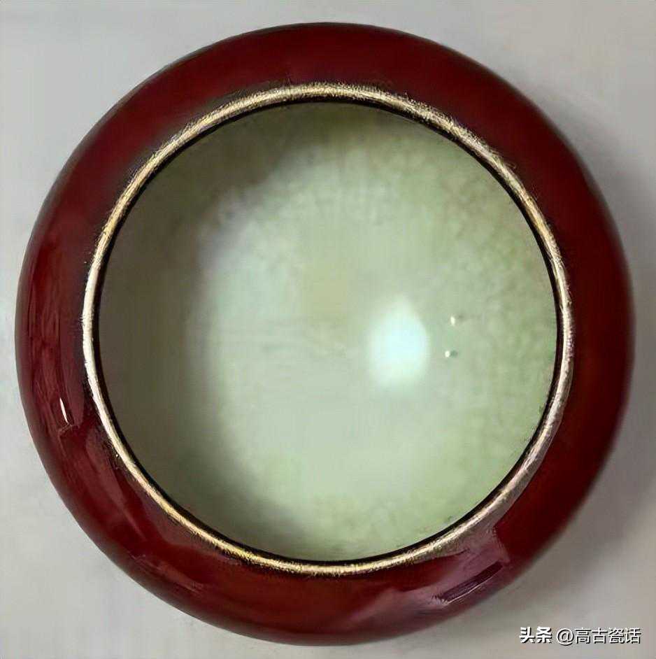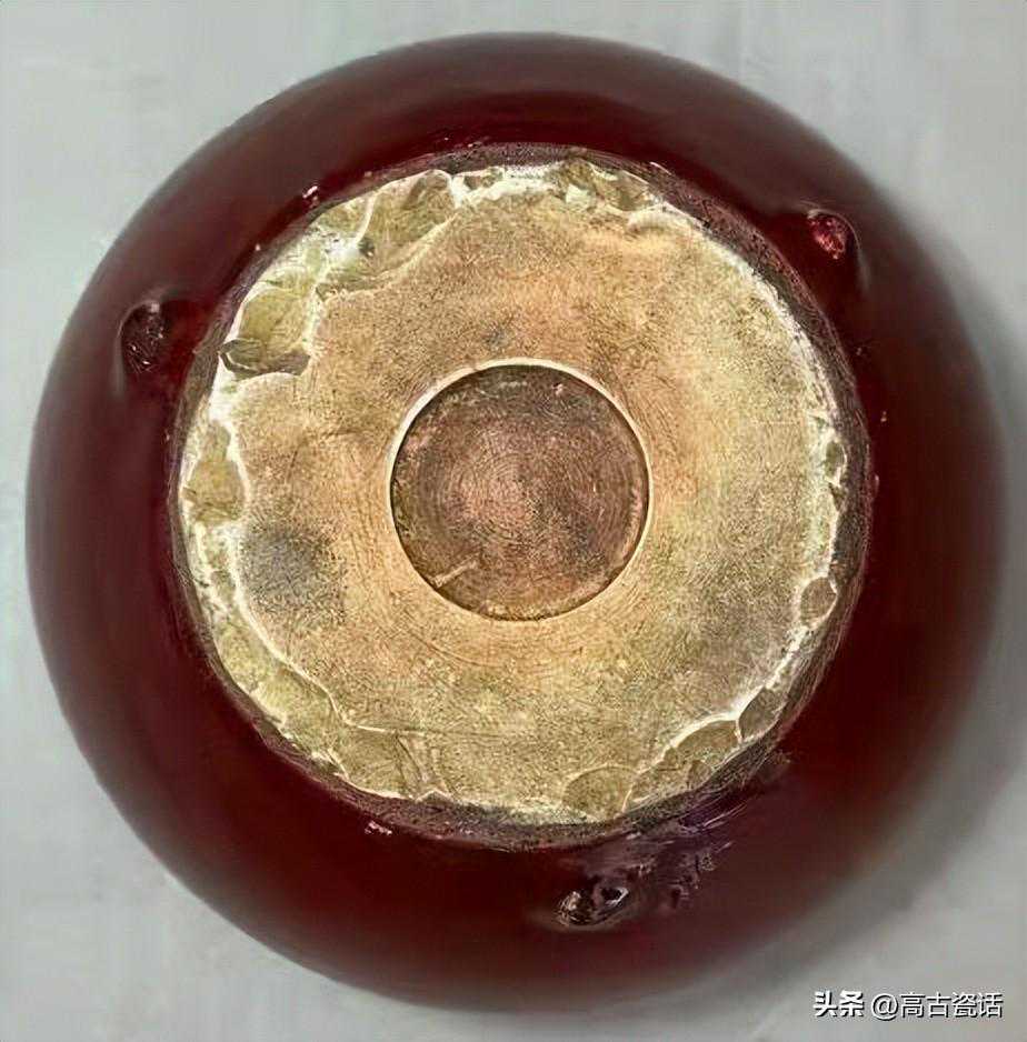 解说:我们看这件仿乾隆时期的红釉三足洗,就这件仿品而言,第一、洗内口沿下边点点红釉是吹釉留下的,这种高压气泵吹釉是解放后才开始有。第二、红釉釉色暗红发闷,釉质浑浊,不通透,反光湿黏漂浮,口沿泛黑,不是灯草口。第三、白釉灰暗,开片生硬,沁色在釉面,脏油腻。第四、底足胎质坚硬致密,表面潮湿,附着灰垢一致,粉尘油湿。与真品相比,真品红釉纯正通透,釉质细腻熔融,玻璃感强。灯草口泾渭分明,底胎干老,有长期使用的包浆老旧痕迹。