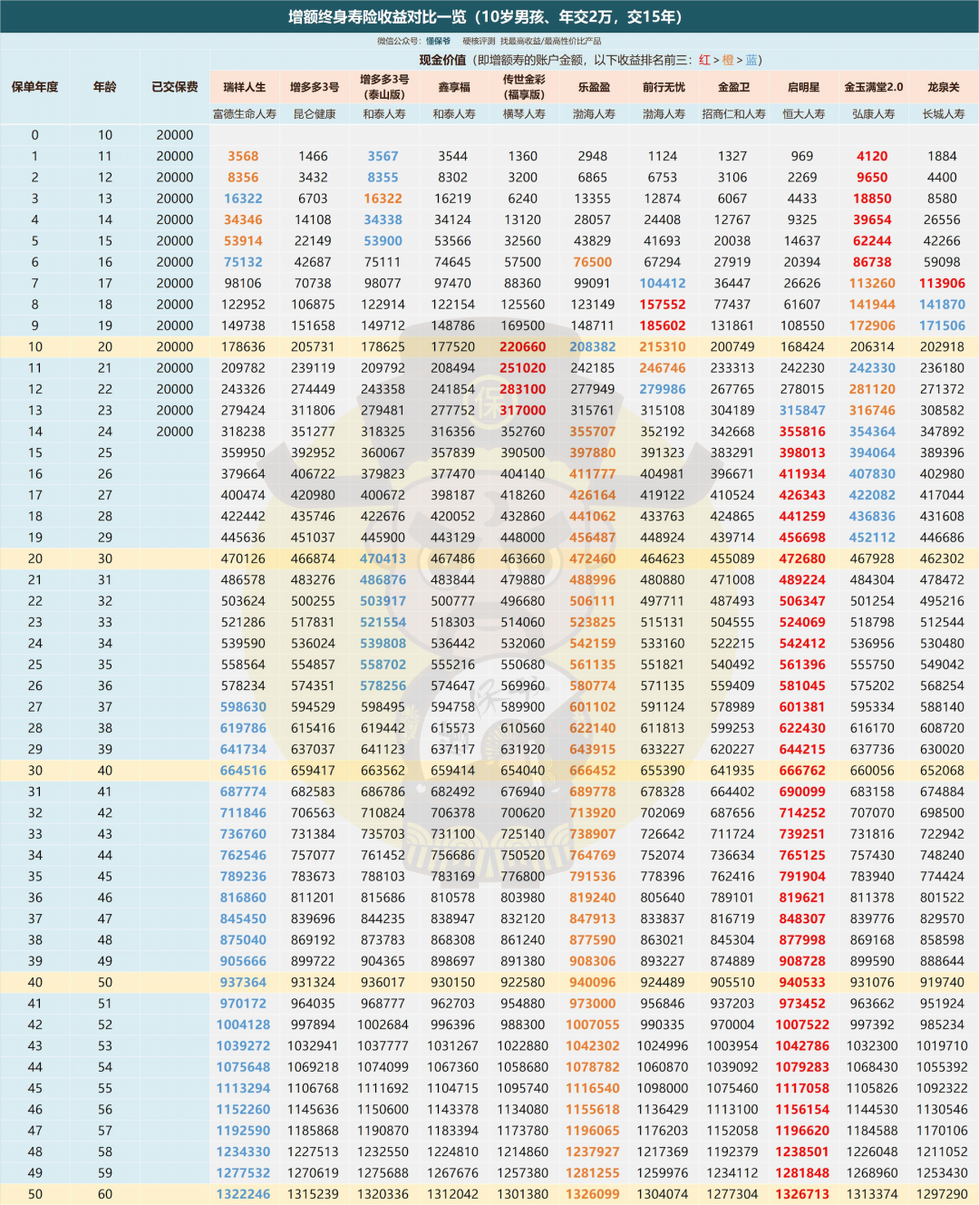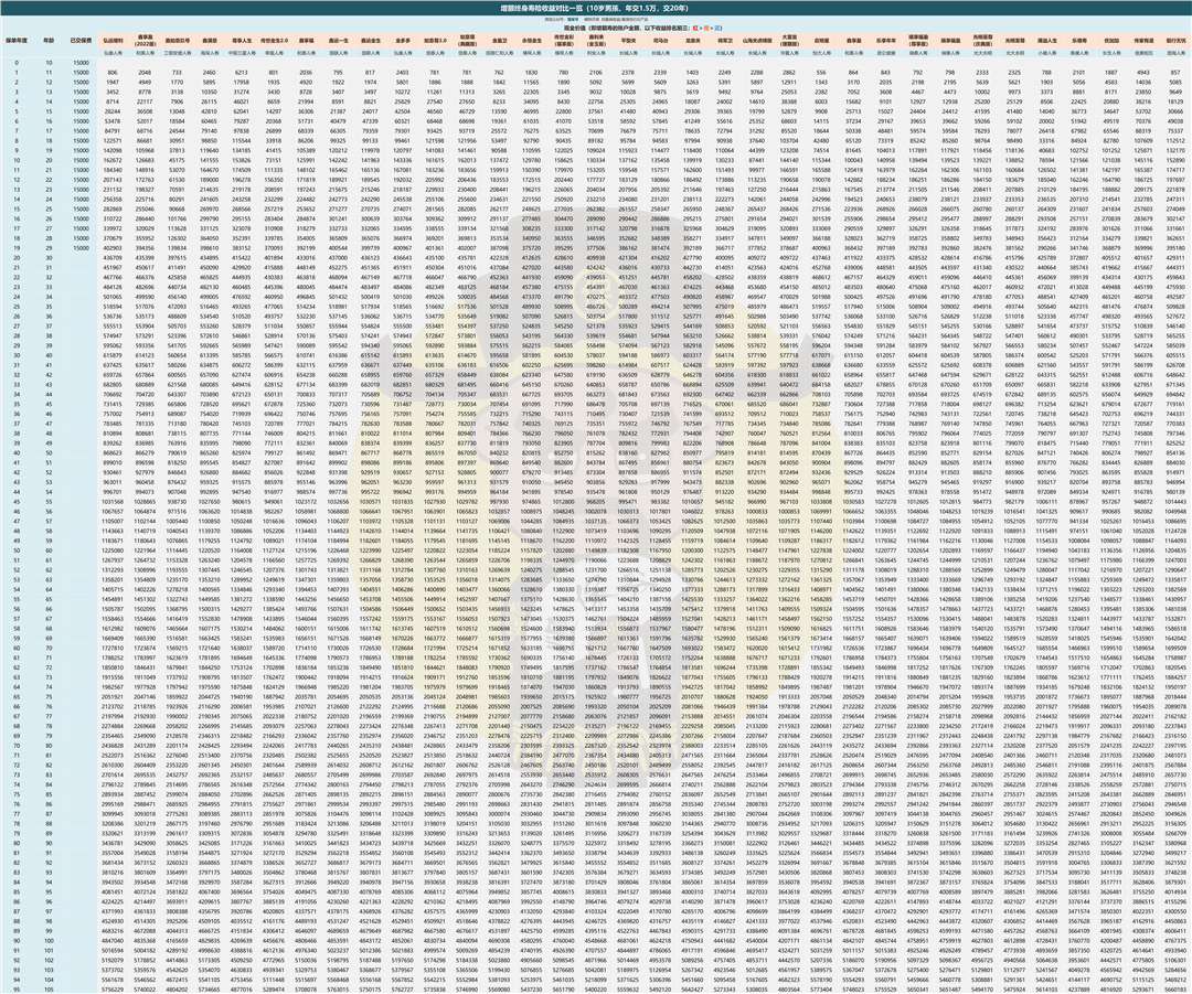 以10岁男孩,本金30万为例,把目前支持15年、20年交的几十家保险公司的增额寿都放一起对比。