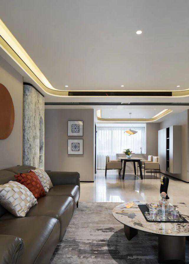 风格,并非一成不变;质感,讲究层层递进。木、石、皮、布与金属等材质,在客餐厅内进行自由的情绪表达,彰显了空间的态度。圆弧的元素,蕴含着流动性与轮廓感,将艺术张力转译成空间韵律。