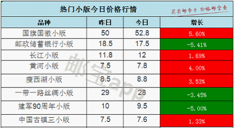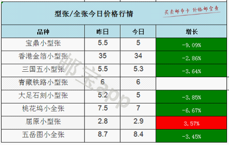 特别提醒:邮宝APP中所有产品的价格为市场大宗交易价格、且不含税点。零售价可能在此基础上浮动10-20%。另外,因篇幅所限,本文亦未列全邮币卡的所有品种。查询更多价格,请登录邮宝APP。