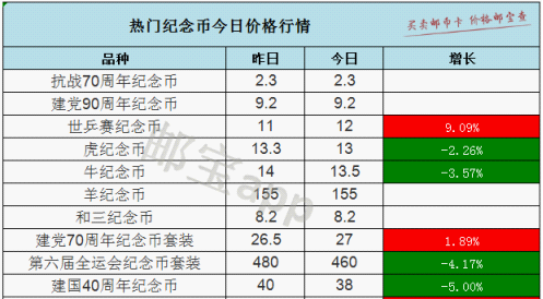 世乒赛纪念币9日最新价格为12元,8日价格为11元,涨幅9.09%